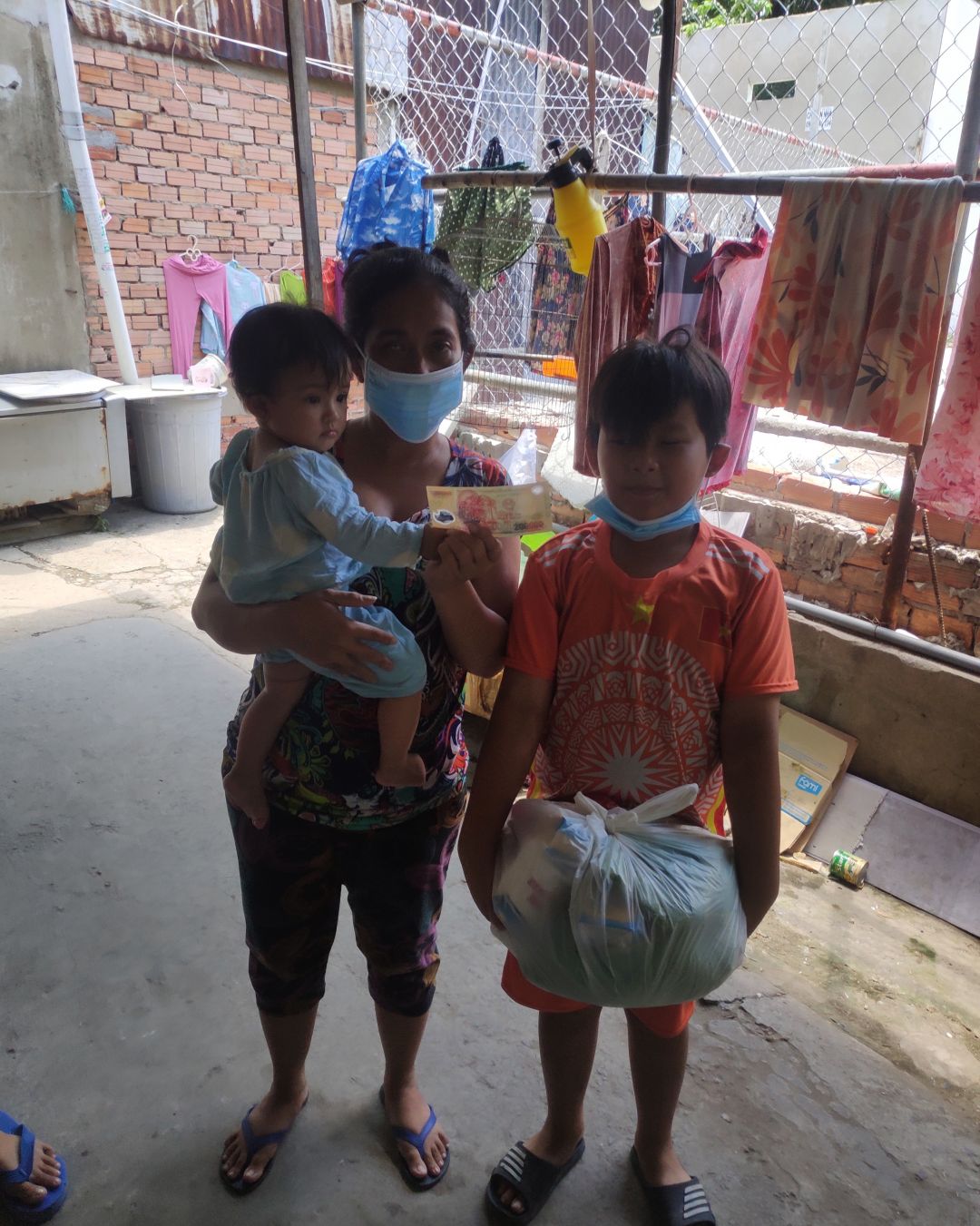 Hình ảnh 3 mẹ con đến nhà trọ Mai Trâm nhận Quà.