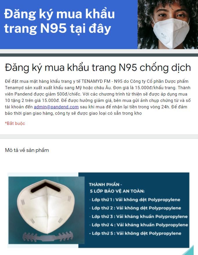 Mai tan xin để xuất mua khẩu trang N95 của Tenamyd : 10.000 đ.chiếc * 1.560 chiếc = 15.600.000 để tặng cho đoàn công tác. Mong BQT xem xét phê duyệt .