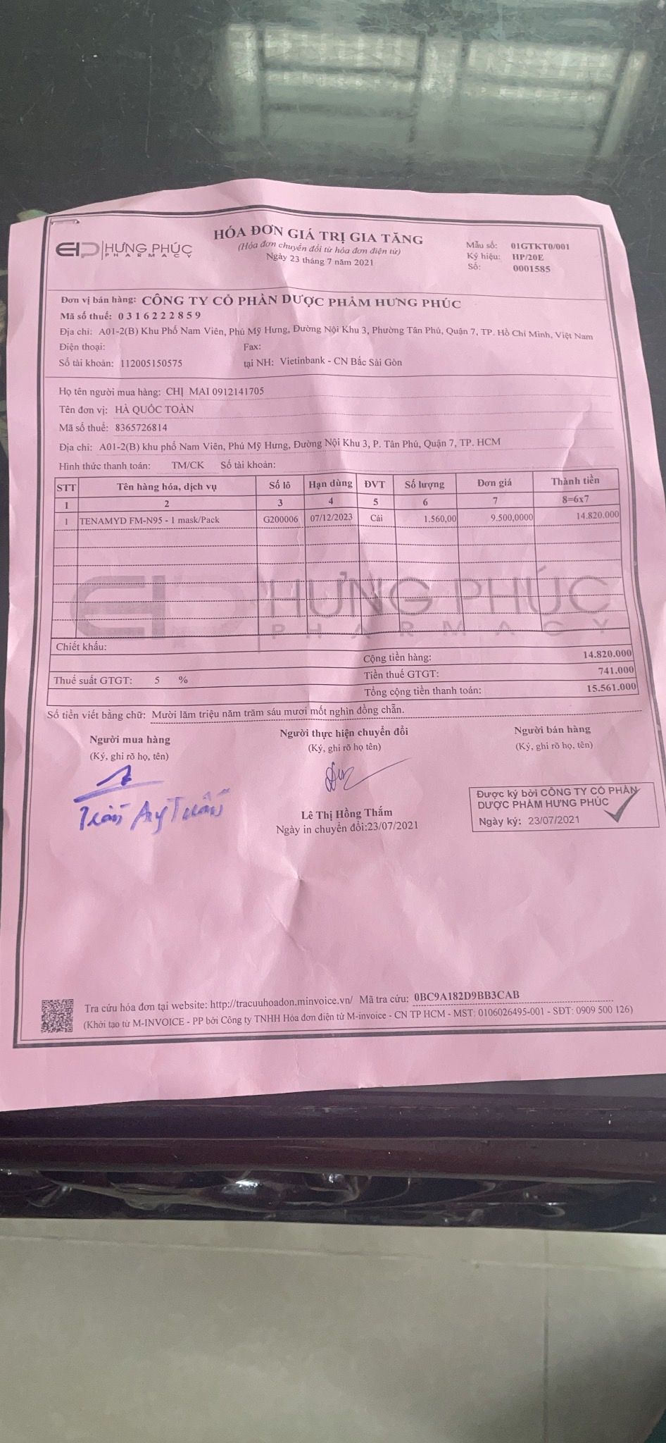 @Thocon : Em chuyển 15,600,000đ tiền mua 1560 khẩu trang N95 tới Cty Cổ phần dược phẩm Hưng Phúc dùm nhé.