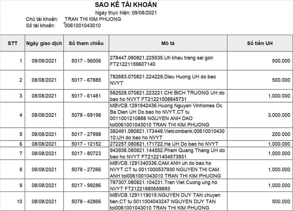 Sao kê của Chương trình tính đến ngày 9/8/2021