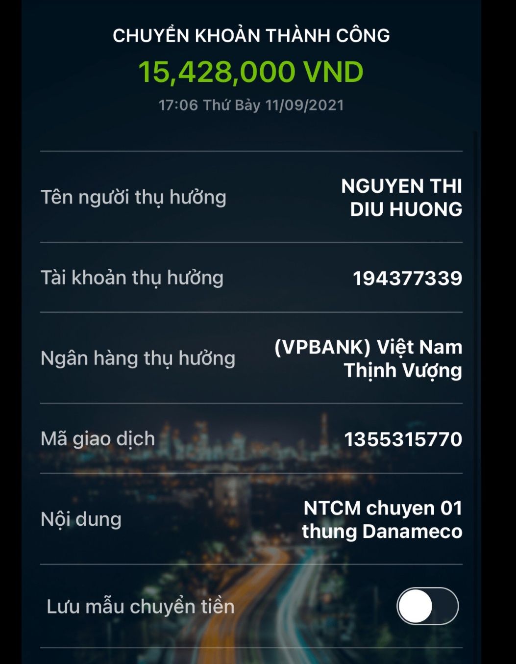Số tiền này xin  chuyển cho Số TK 194377339 - Chủ TK Nguyễn Thị Dịu Hương - Ngân hàng VP Bank - Cú pháp NTCM - 1 thùng Danameco