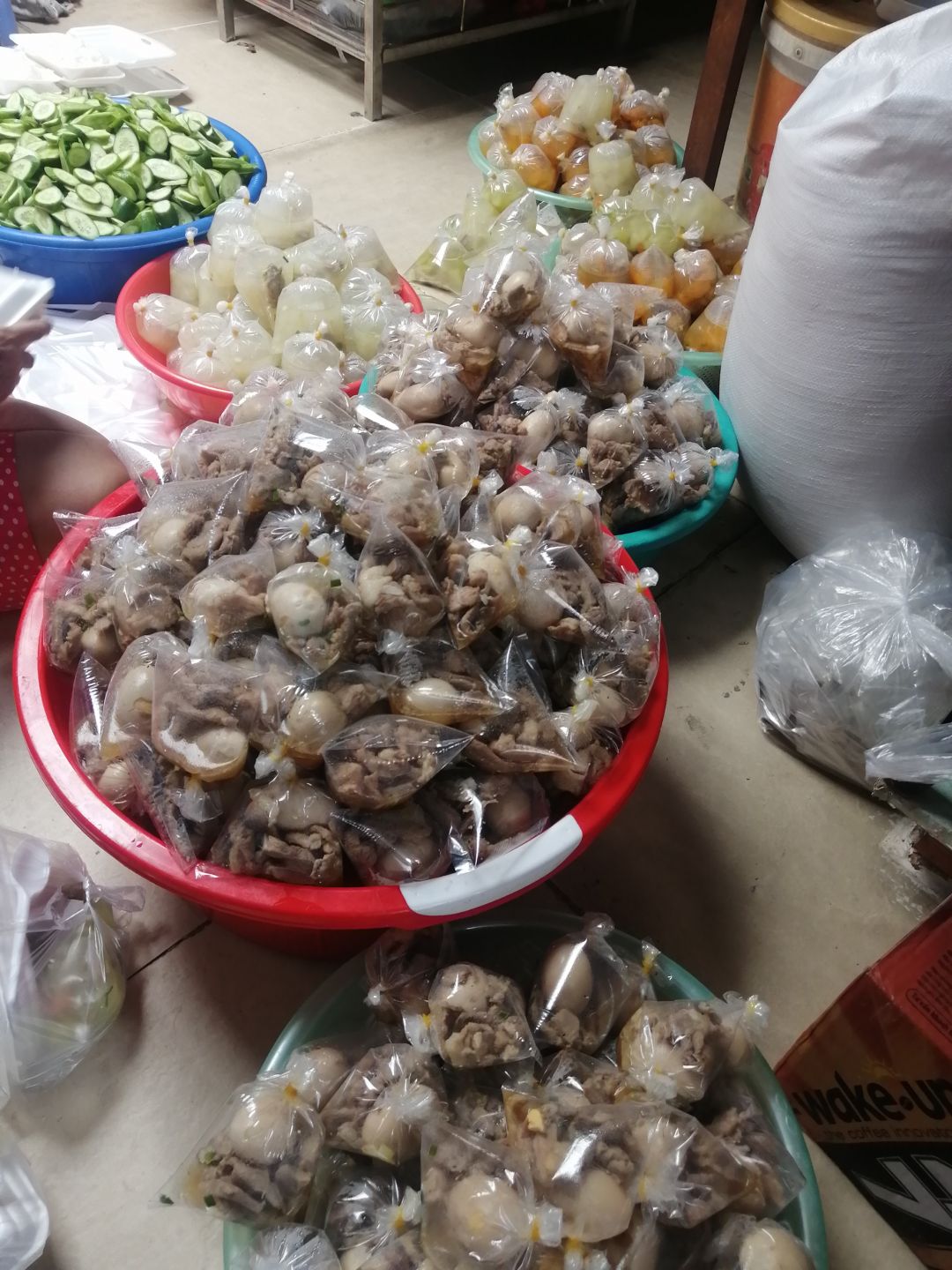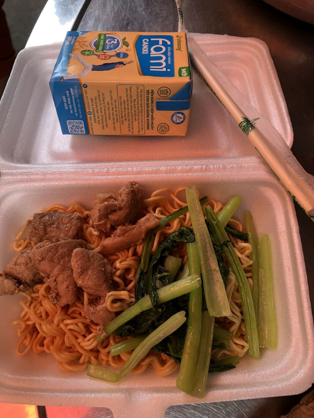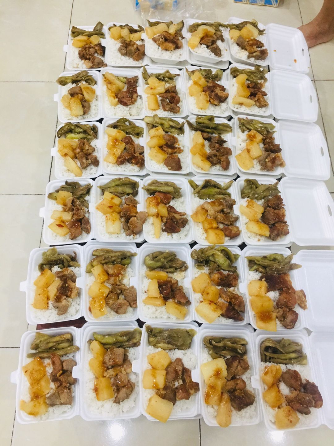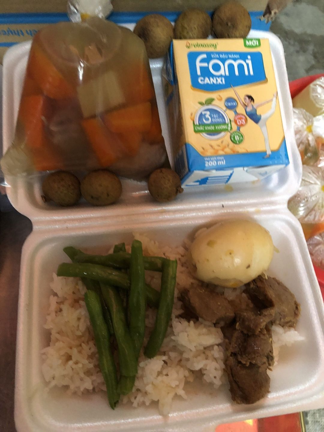 Chiều : 60 phần cơm thịt kho hột vịt, đậu ve xào, canh suop, sữa Fami, nhãn