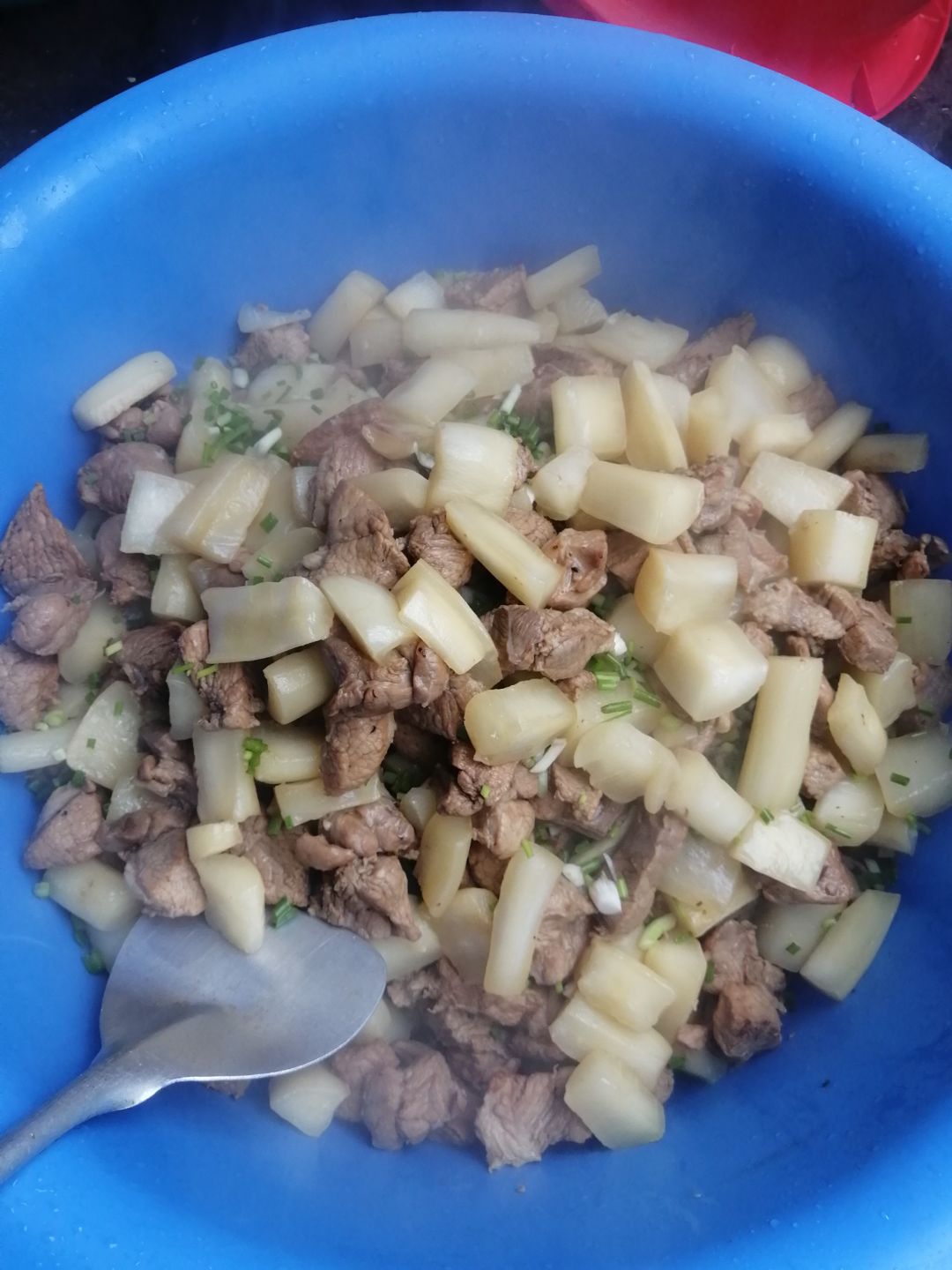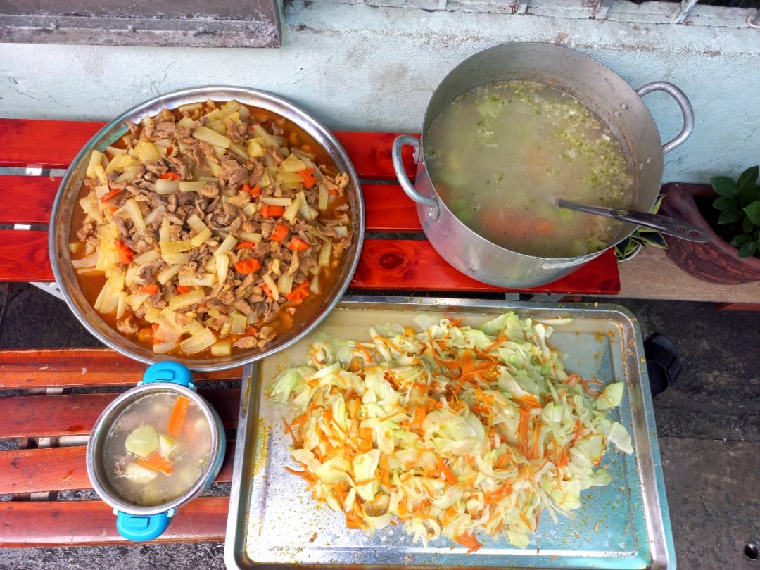 Chiều nấu 225 phần cơm thịt kho củ cải trắng; bắp cải xào tỏi tây; canh cải thảo+ sườn que và sữa Fami.