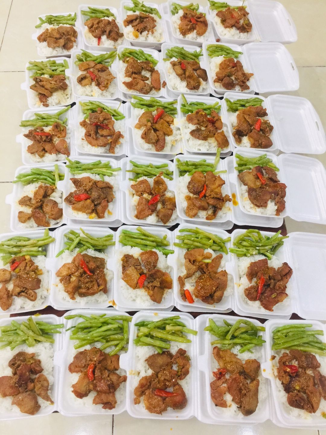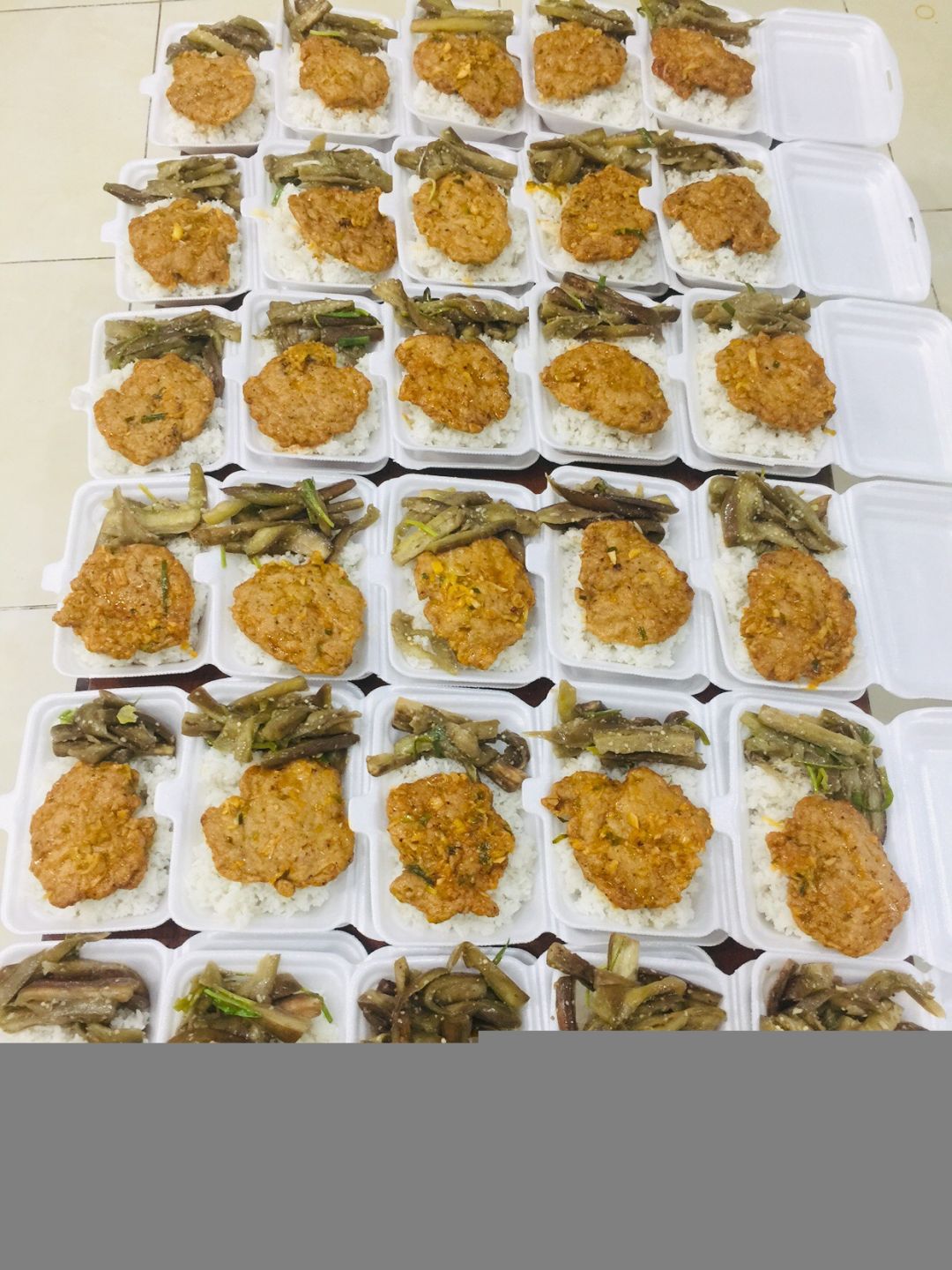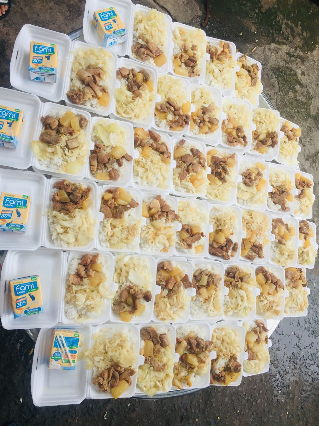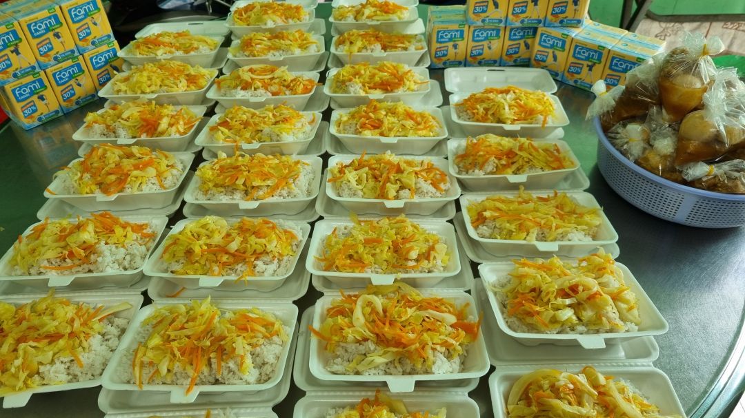 Chiều nấu 250 phần cơm thịt heo kho củ cải trắng; bắp cải xào boa rô( tỏi tây); canh bí đỏ+ sườn que và sữa Fami.