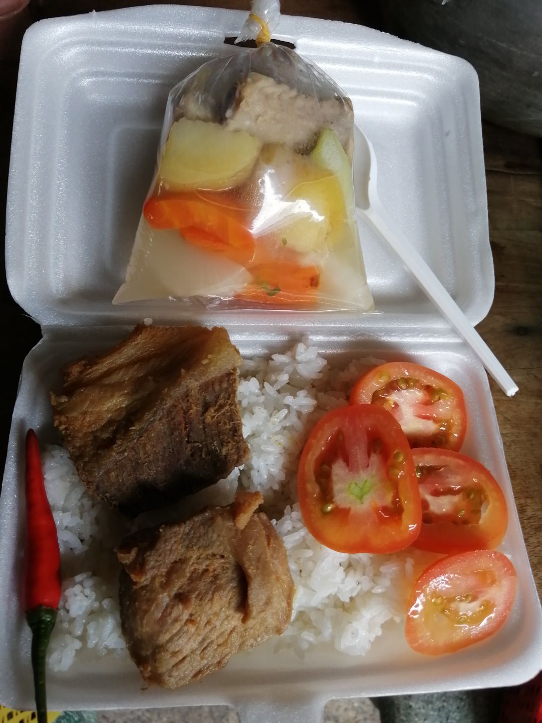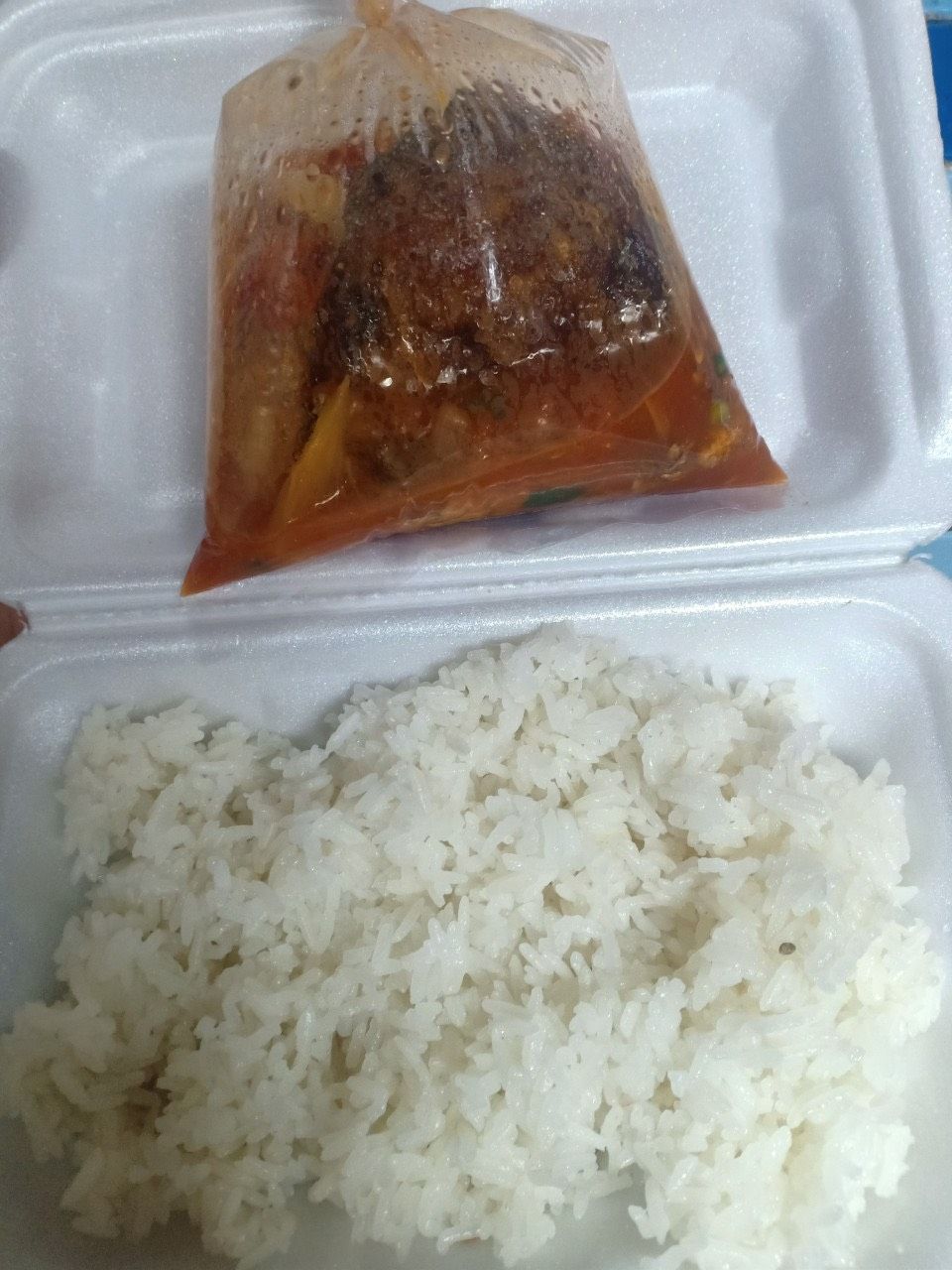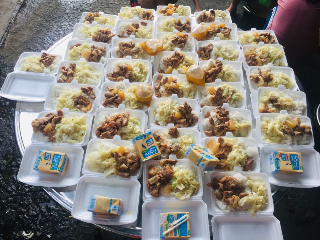 Chiều nấu 250 phần cơm thịt heo kho củ cải trắng; bắp cải xào boa rô( tỏi tây); canh bí đỏ+ sườn que và sữa Fami.