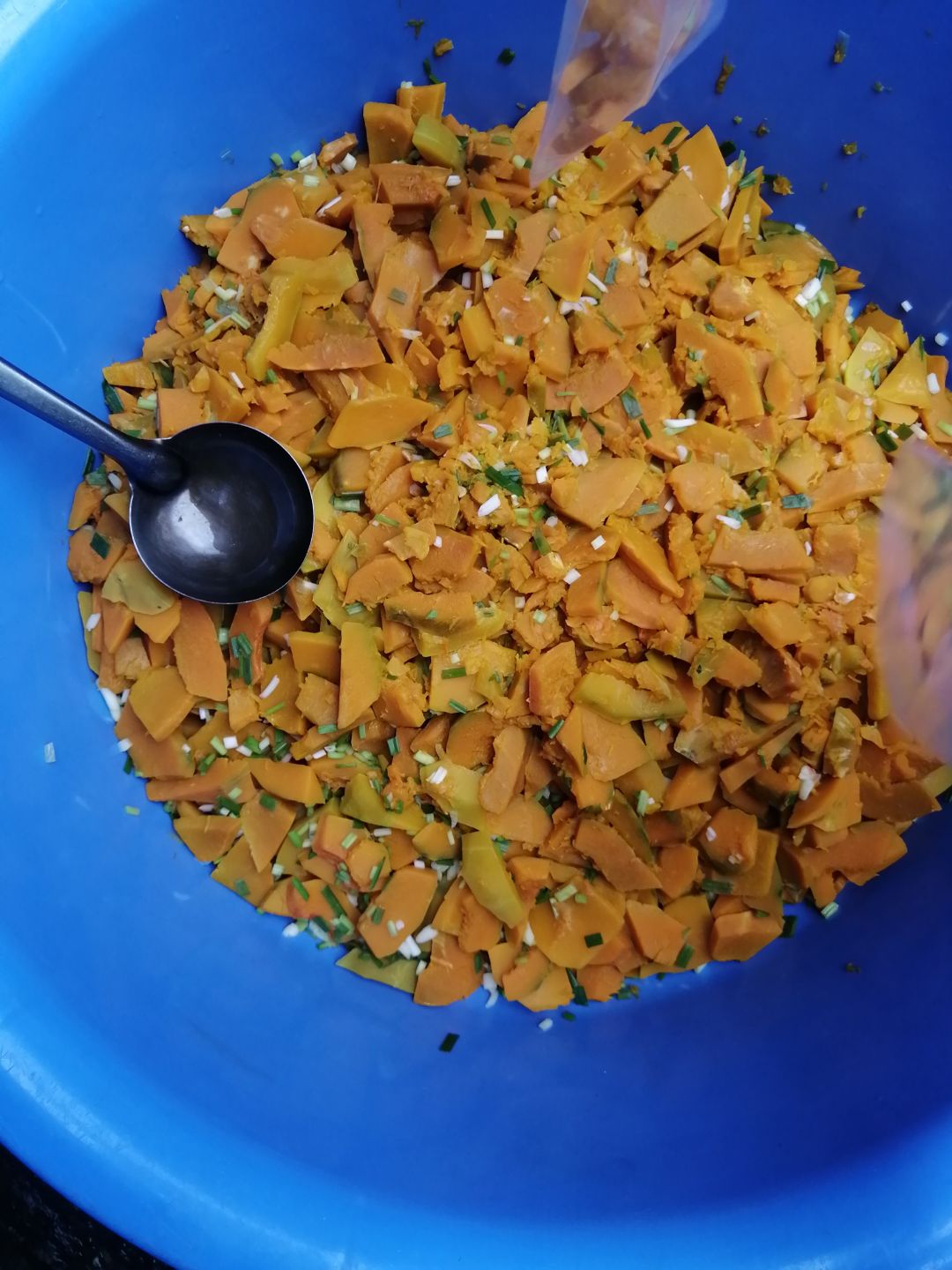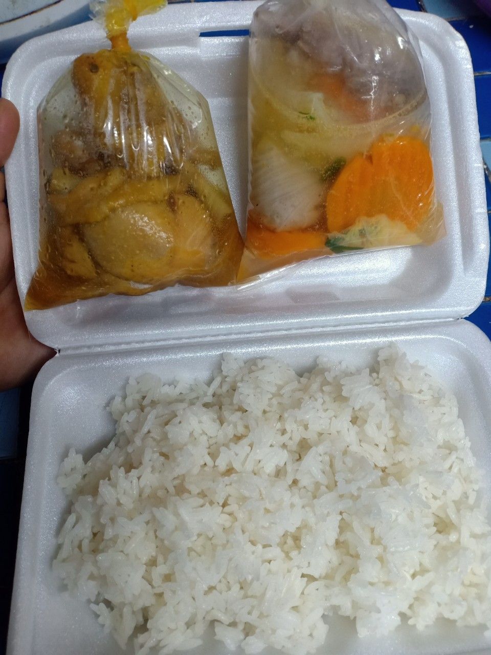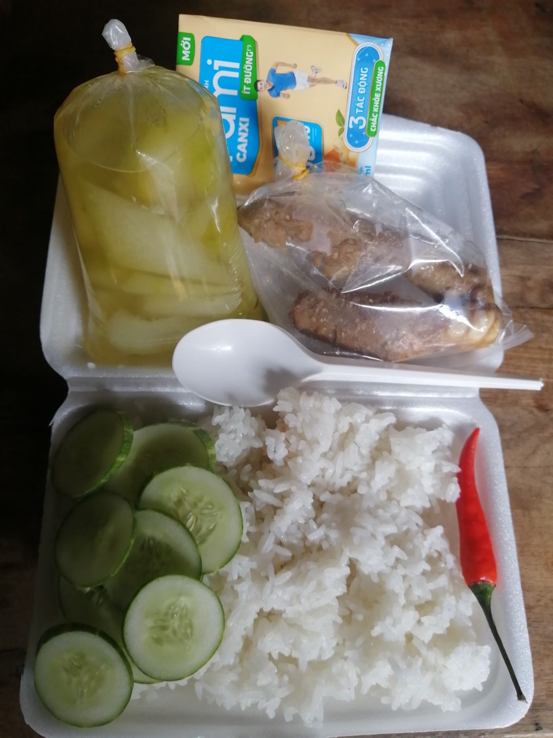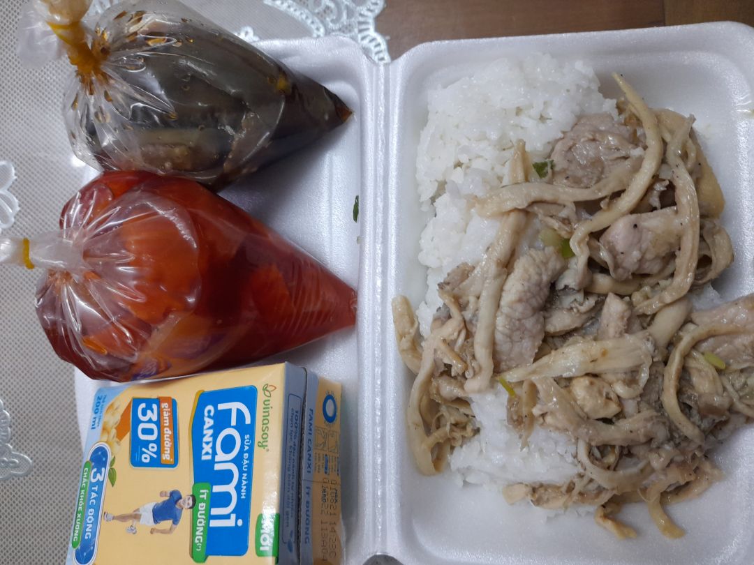 Sáng nấu 235 phần cơm thịt heo kho củ cải trắng; bắp cải xào boa rô; canh bí đỏ+ đậu phộng và sữa Fami.