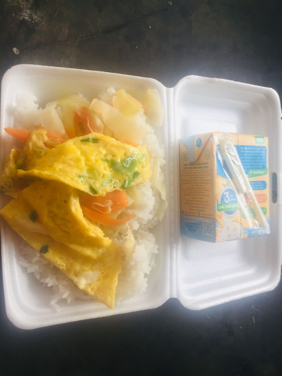 1 suất gồm: Thịt kho trứng gà. Bắp cải cà rốt xào tỏi. 1 hộp sữa đậu nành .