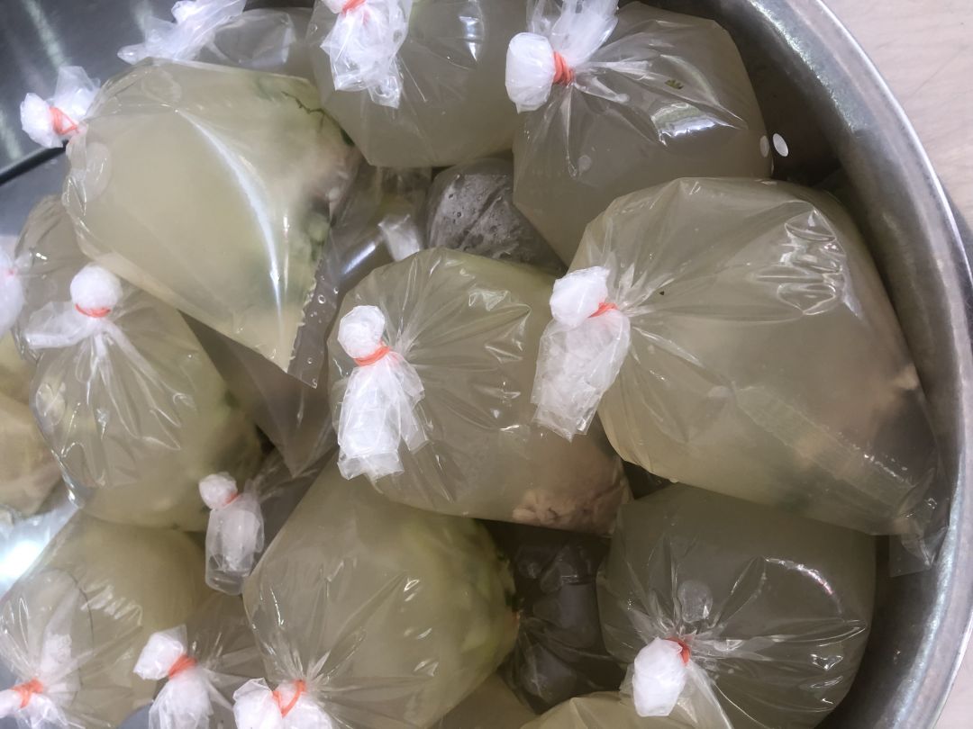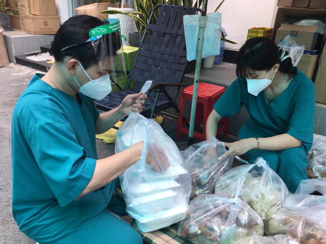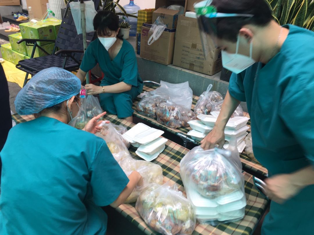 Hôm nay bếp Thảo giao cơm trực tiếp ở Bệnh viện Bình Dân để các bạn trong bộ phận hỗ trợ của bệnh viện phân chia lại thành từng phần trước khi giao đến Bệnh viện Dã chiến số 8. Mỗi phần gồm túi ni lông đựng hộp cơm, thịt gà kho củ cải và canh cải thảo. Các bệnh nhân sẽ nhận suất ăn đầy đủ và thuận tiện hơn.