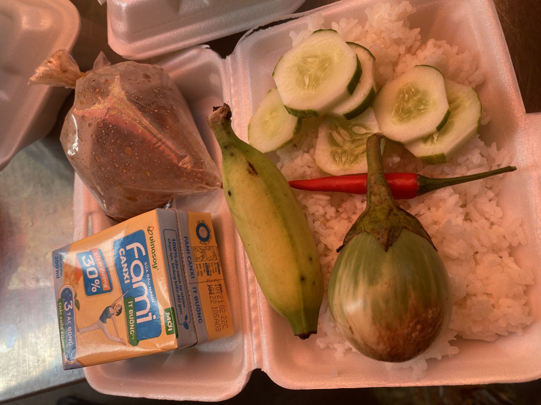 - 60 phần cơm trưa khá đơn giản với thịt xào mắm ruốc, dưa leo, cà gì đó k biết (hihi), sữa Fami, tráng miệng chuối.