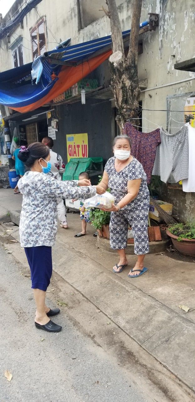 Đồng nghiệp Hữu Công hổ trợ 1 bao bắp nếp, lathuvang nhờ chị Chữ Thập Đỏ tặng các hộ gia đình trong khu cách ly của Phường 15- Q10.