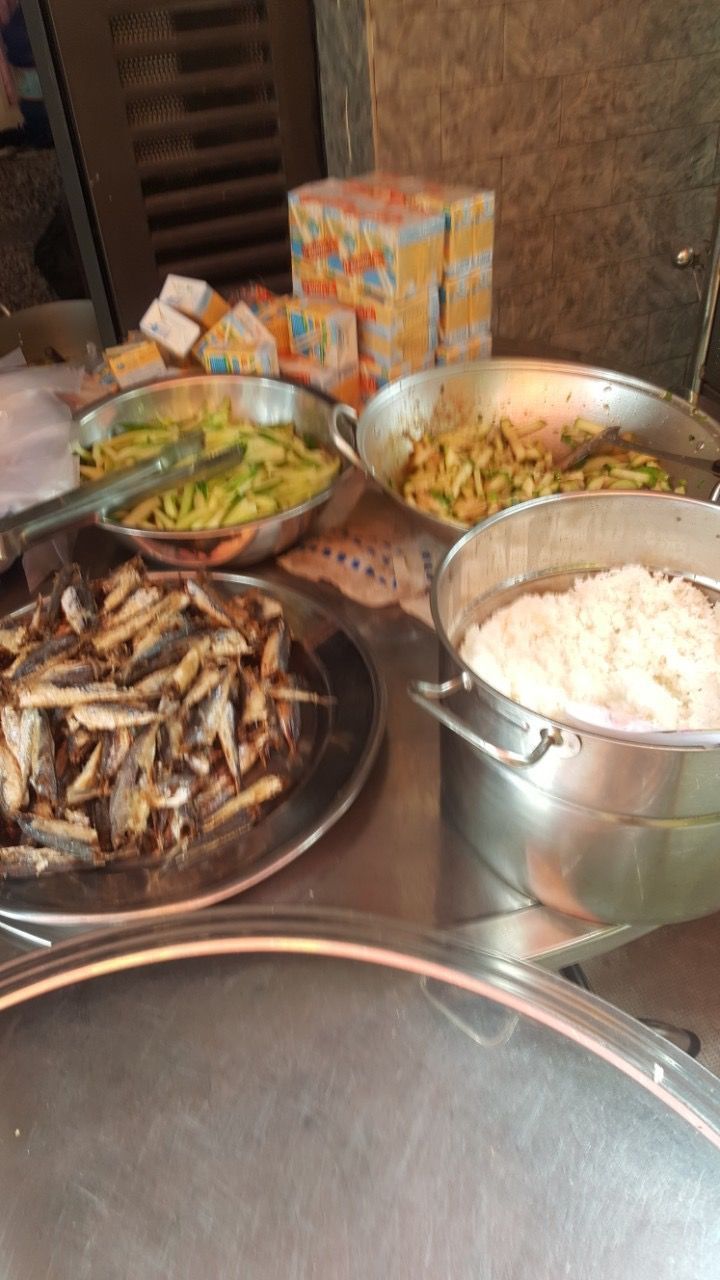 Thực đơn trưa : khô cá chiên, dưa leo xào, canh bầu, sữa Fami.