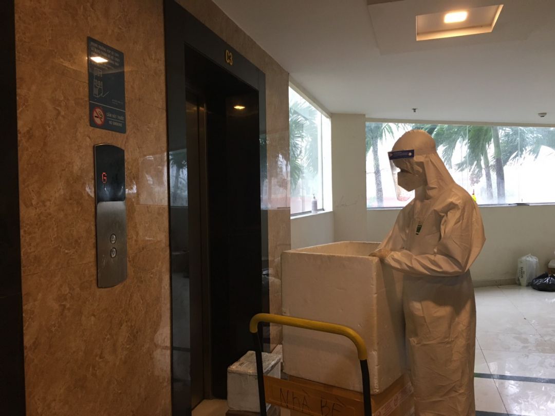 Hình ảnh nhân viên trang bị đồ bảo hộ, chuẩn bị giao suất ăn đến cho người bệnh.