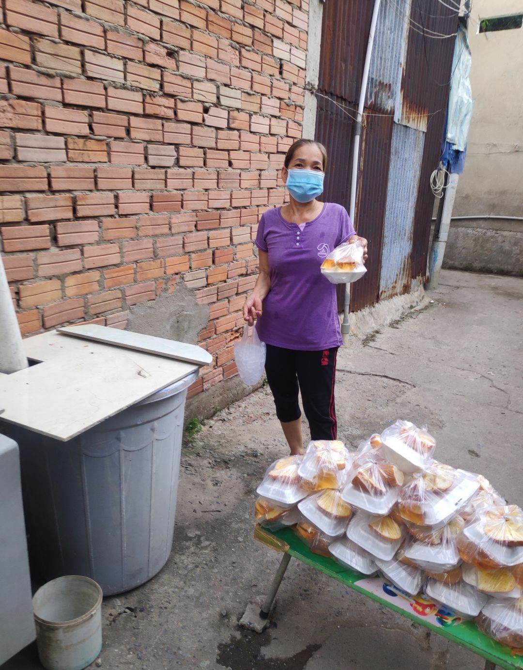 Buổi làm bún thịt lụi có sự hỗ trợ  của chị Năm chủ nhà trọ và chị Lành một trong 38 hộ đang ký nhận sự hỗ trợ bữa cơm cùng tham gia giúp Mai Trâm.buổi phát bún thịt lụi ngày hôm nay có kèm theo bánh mì của bạnbè6x hỗ trợ thêm cho khẩu phần ăn.