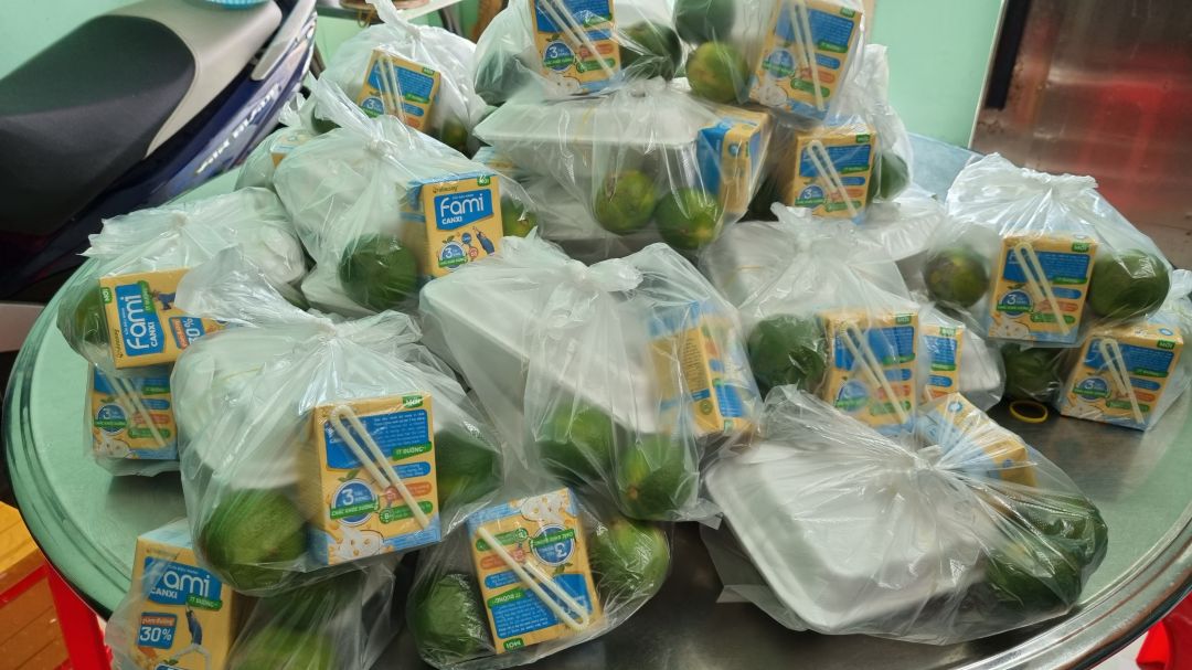 Và chuyển 83 phần quà đến 83 phòng trọ tại 126 Trần Thanh Mại, Bình Tân, mỗi phần bao gồm : 2kg gạo, 10 gói mì, 5 trứng vịt, 4 miếng đậu hủ, bịch khô cá cơm 200gr, khô cá chỉ vàng do bà con Quảng Trị tặng, 200 bịch sữa cho 20 bé, 100kg cải xanh, khoảng 50kg củ các loại.