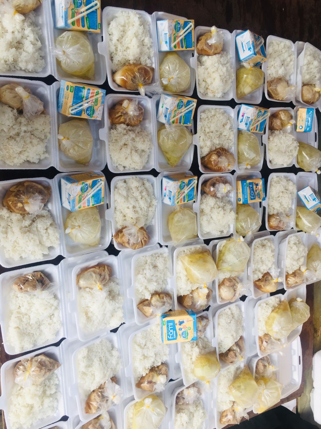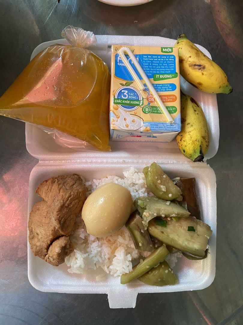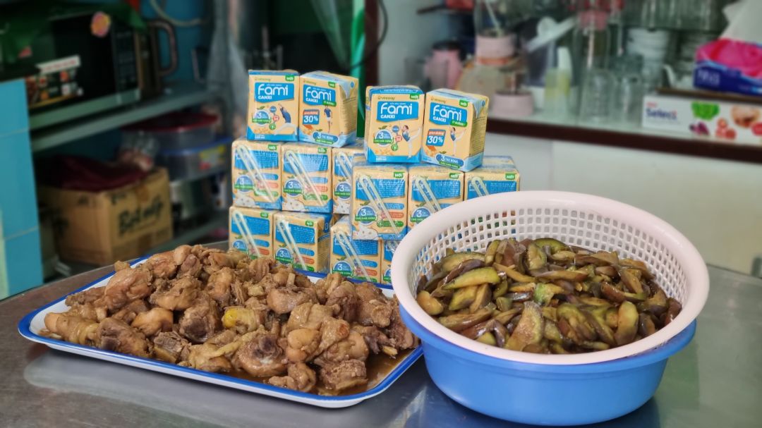 Chiều nấu 150 phần cơm thịt heo kho trứng vịt; canh bắp cải thảo sườn que và sữa Fami.