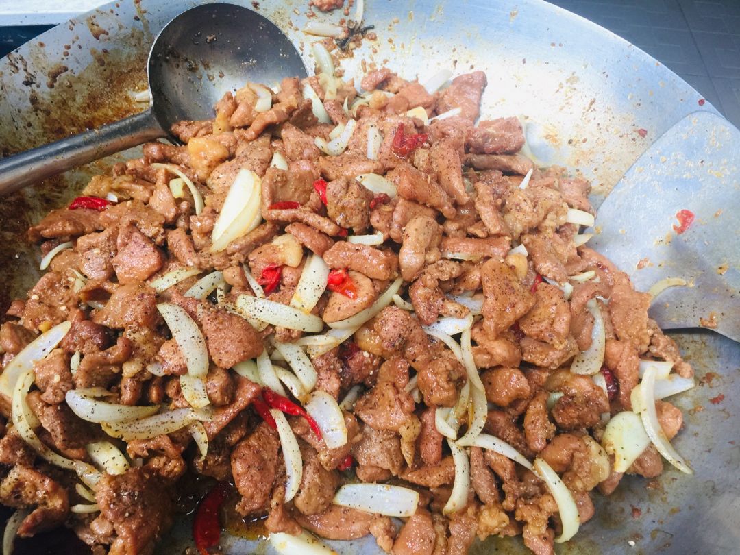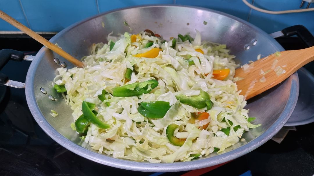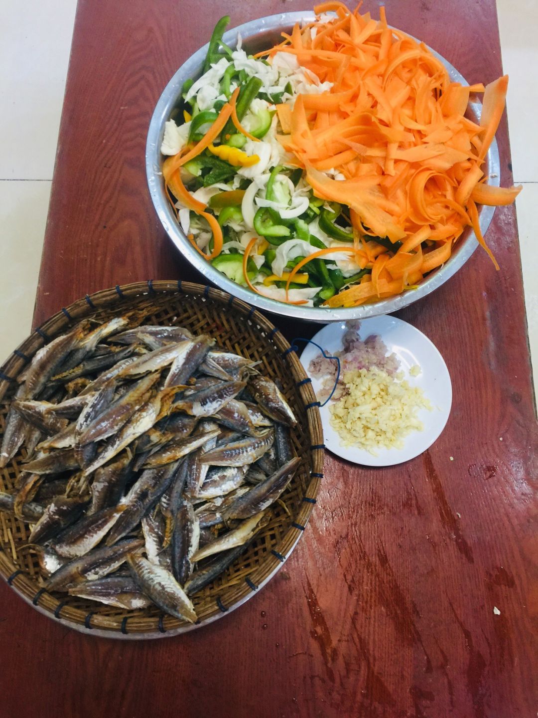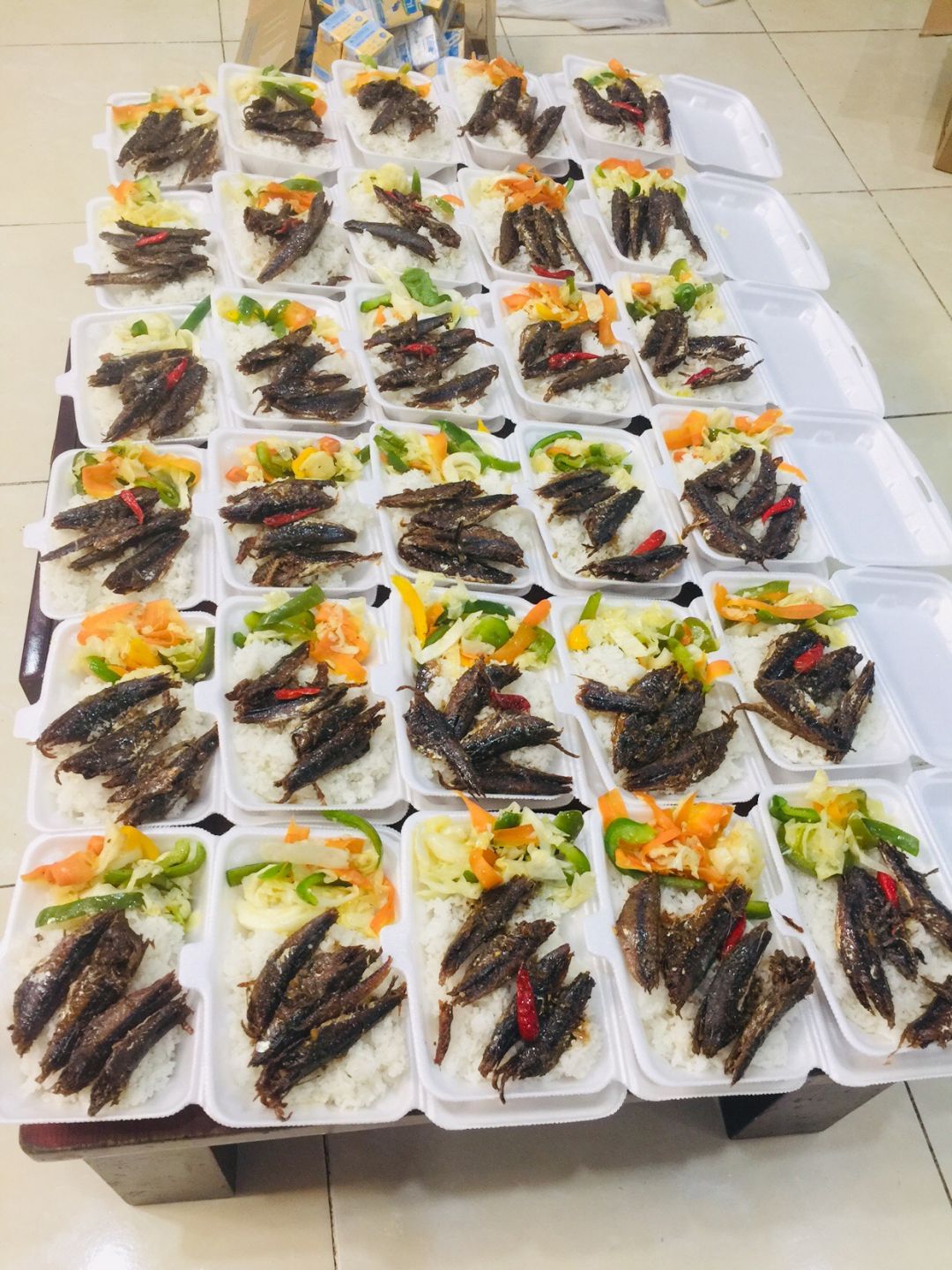 Sáng nấu 170 phần cơm cá chiên sốt cà chua+ ớt chuông, bắp cải + cà rốt+ hành tây+ ớt chuông xào.