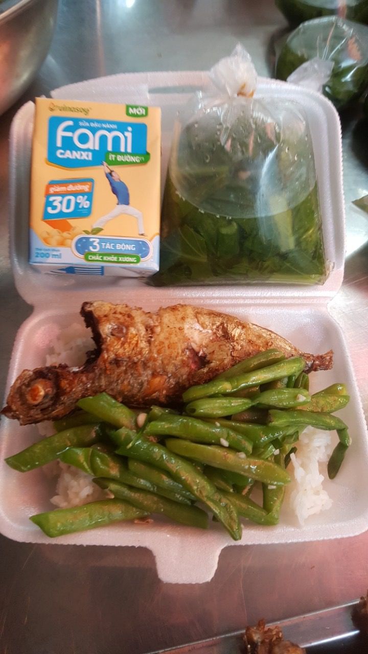 Thực đơn 5/8 : Cá bạc má chiên, đậu que xào, canh cải bẹ xanh thịt bằm, sữa Fami.