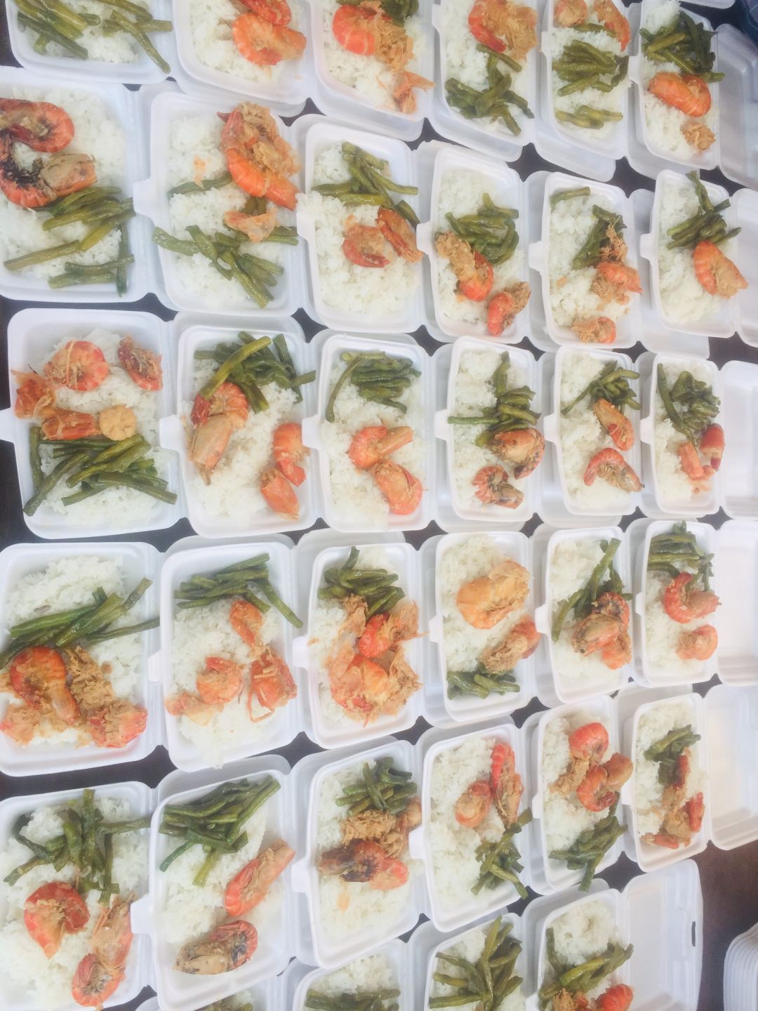 Sáng nấu 170 phần cơm tôm càng xanh rim tỏi, đậu đũa xào, canh đu đủ+ sườn que và sữa Fami