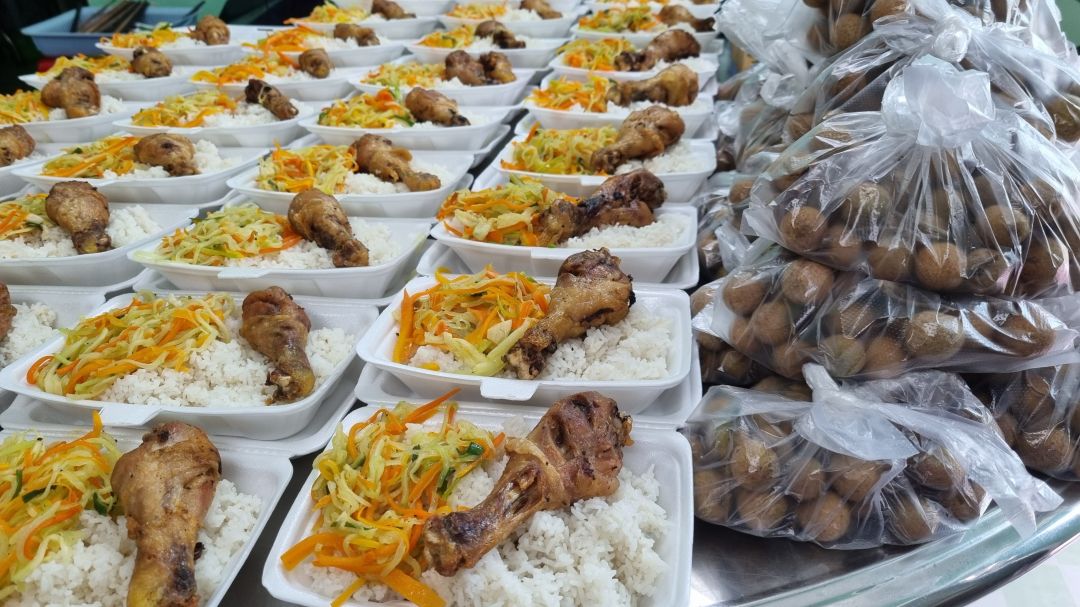 Chiều nấu 160 phần cơm thịt gà kho gừng sả; mướp+ cà tím xào; trứng chiên và sữa Fami