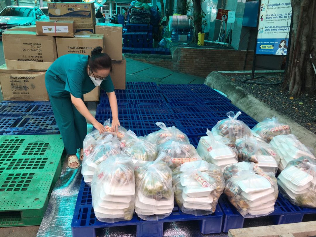 Hôm nay bếp Thảo giao cơm trực tiếp ở Bệnh viện Bình Dân để các bạn trong bộ phận hỗ trợ của bệnh viện phân chia lại thành từng phần trước khi giao đến Bệnh viện Dã chiến số 8. Mỗi phần gồm túi ni lông đựng hộp cơm, thịt gà kho củ cải và canh cải thảo. Các bệnh nhân sẽ nhận suất ăn đầy đủ và thuận tiện hơn.