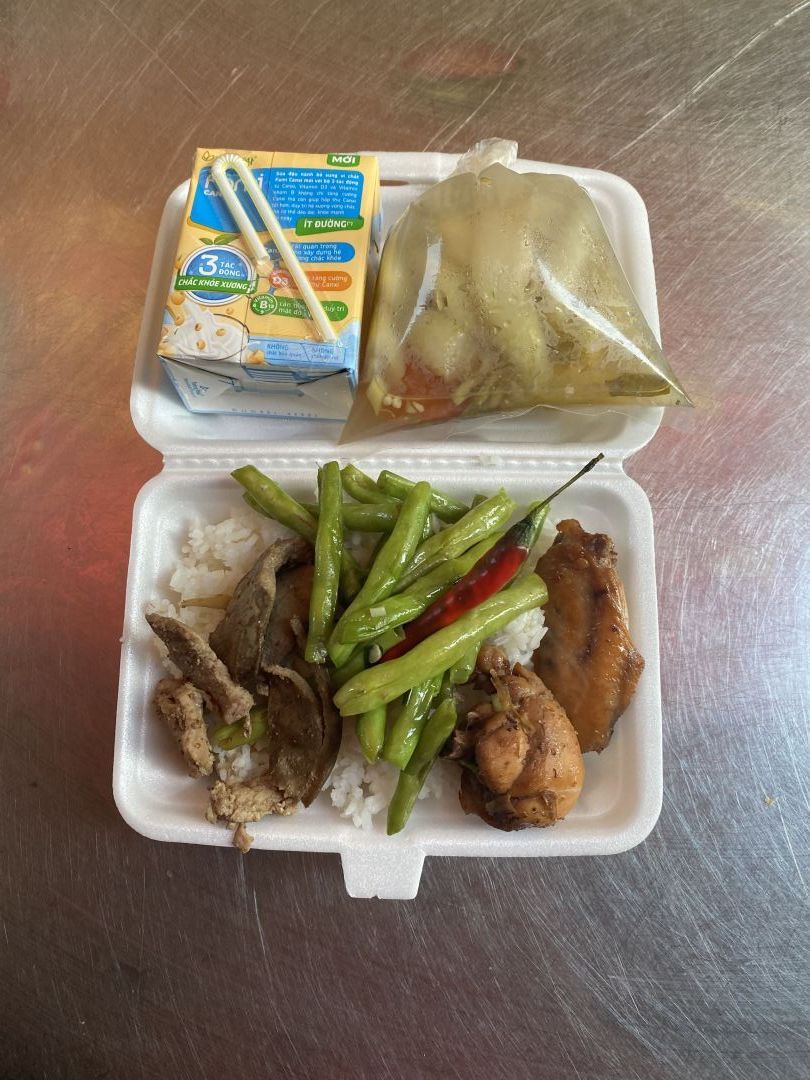 - 90 phần cơm chiều : gà xào gừng, đậu que xào với gan và thịt, canh chua, sữa Fami.