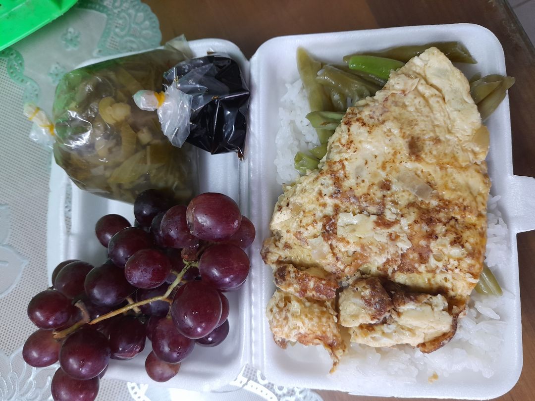- 60 phần cơm trưa khá đơn giản với thịt xào mắm ruốc, dưa leo, cà gì đó k biết (hihi), sữa Fami, tráng miệng chuối.