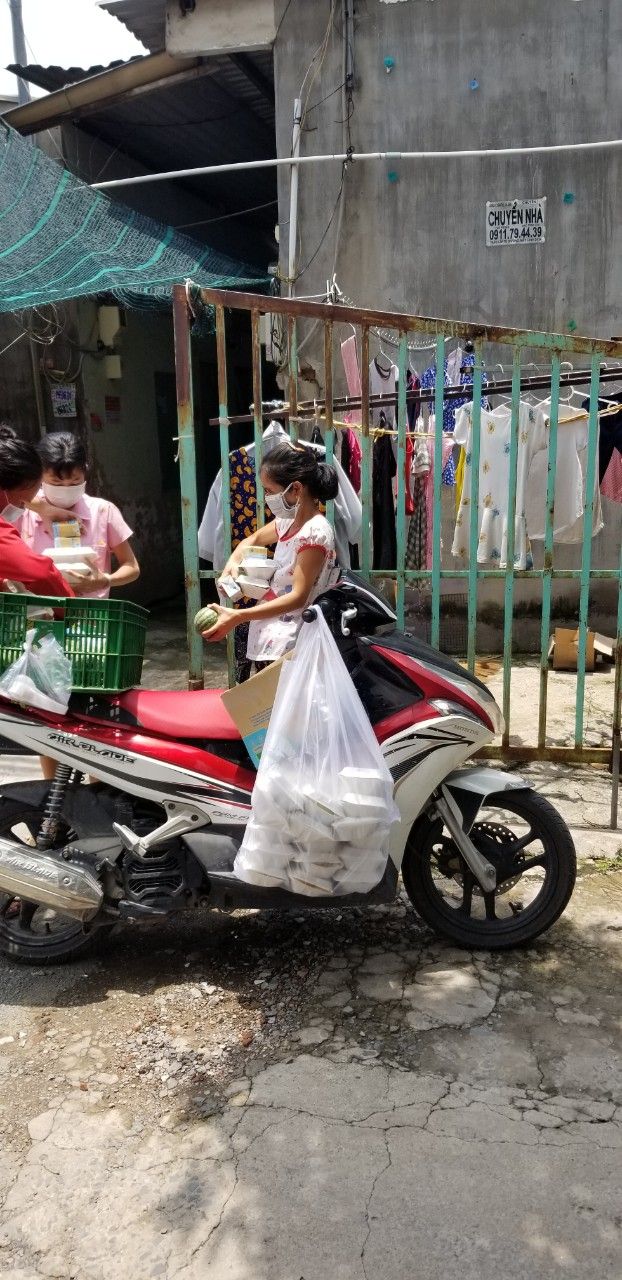 Chiều nấu 190 phần cơm sườn rim tỏi ớt; bầu xào tỏi; canh khoai mỡ+ thịt xay; sữa Fami đem tặng cho các khu thuê trọ nghèo cũng như khu cách ly cho bà con.