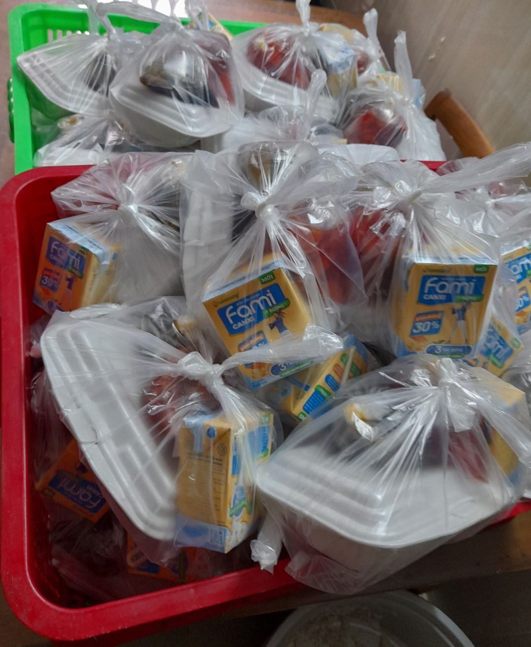 Sáng nấu 235 phần cơm thịt heo kho củ cải trắng; bắp cải xào boa rô; canh bí đỏ+ đậu phộng và sữa Fami.