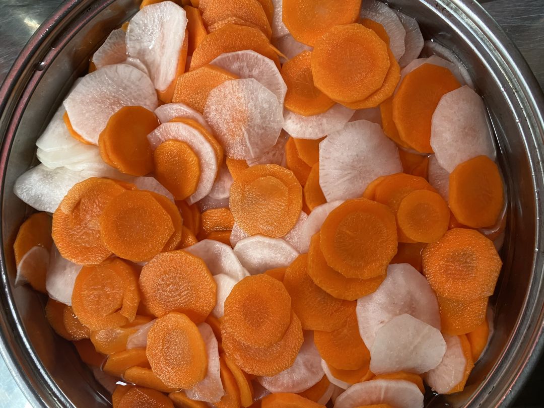 Sáng nấu 245 phần cơm gà rim tỏi ớt; cà rốt+ su su+ hành tây xào tỏi; canh bí đao+ sườn que và sữa Fami