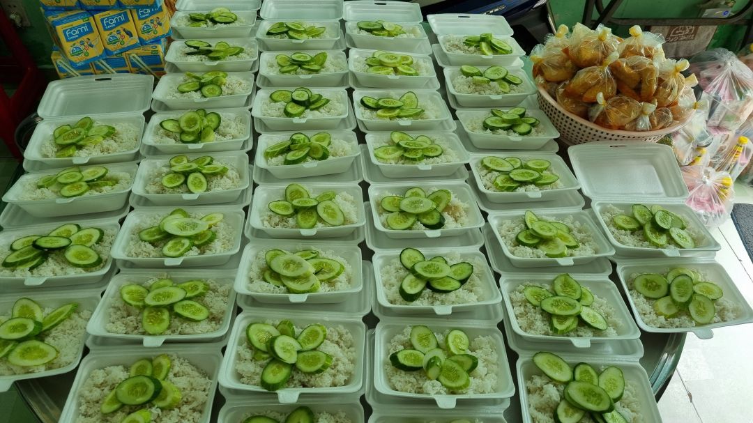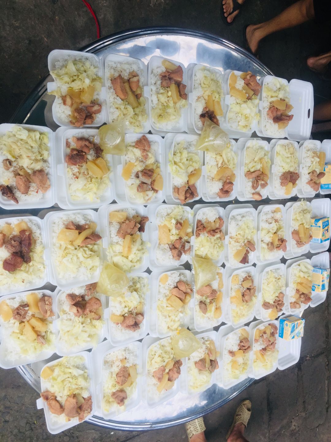 - trưa : 63 phần mì xào thịt và rau củ, sữa Fami