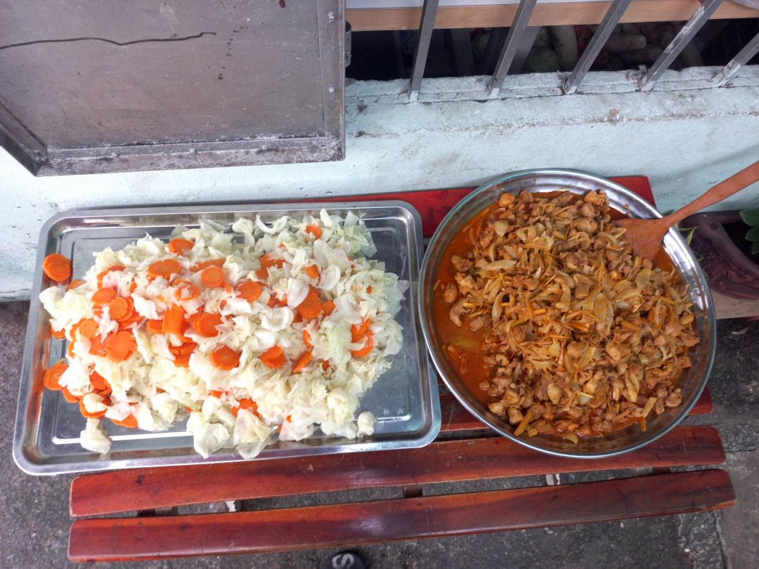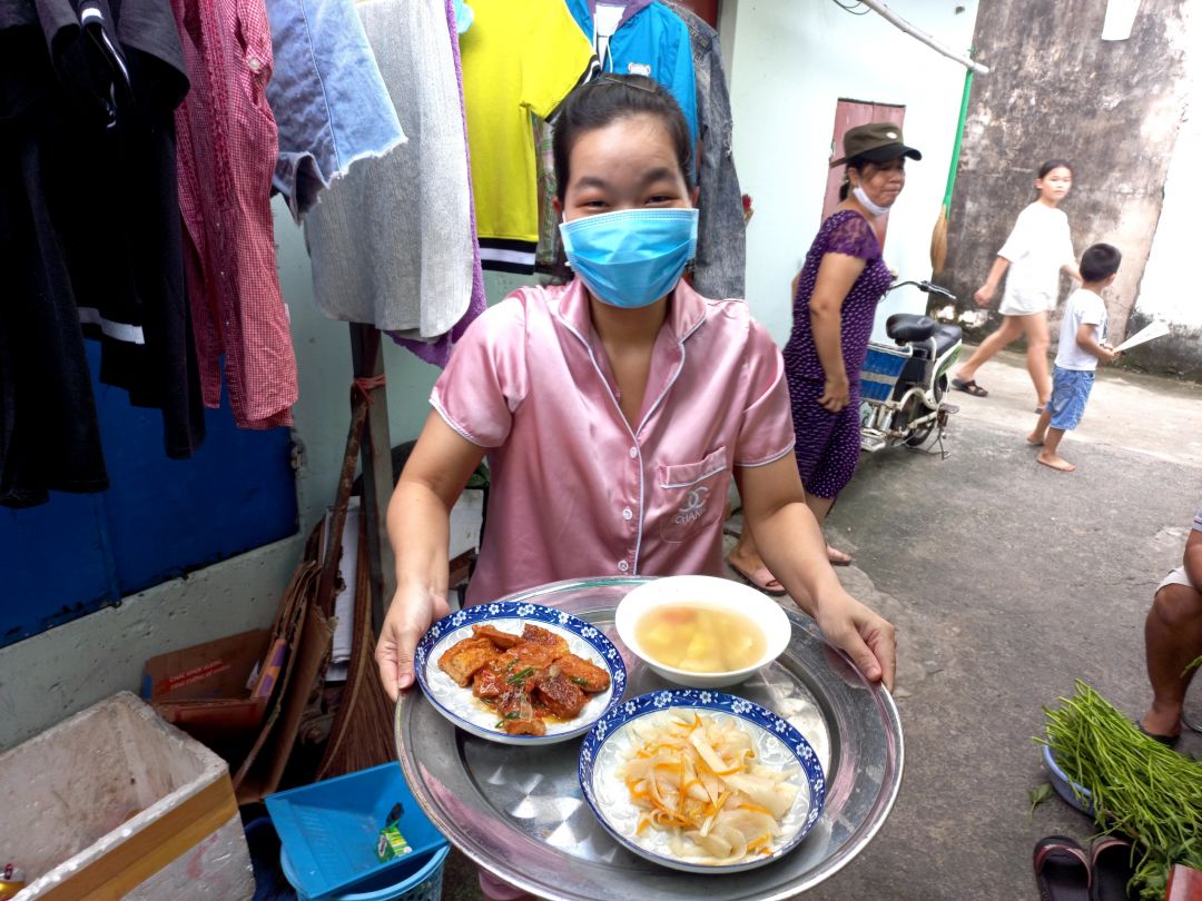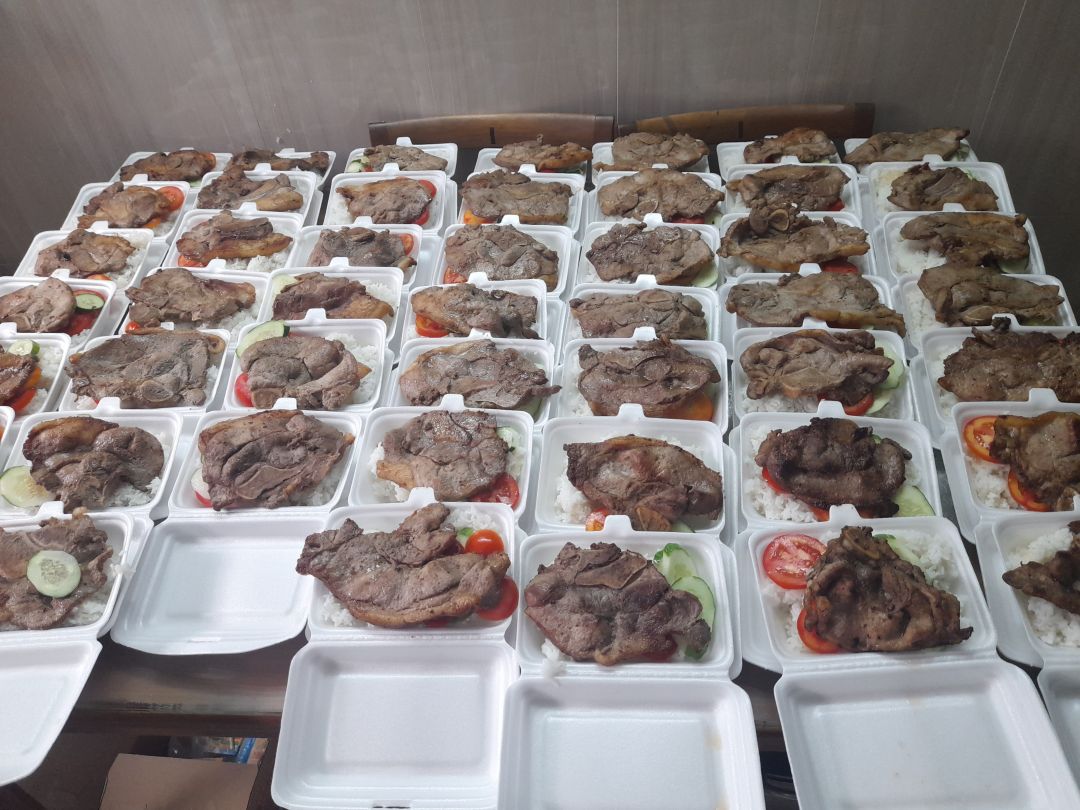 Chiều nấu 225 phần cơm thịt kho củ cải trắng; bắp cải xào tỏi tây; canh cải thảo+ sườn que và sữa Fami.