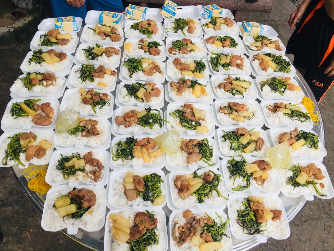 Sáng nấu 252 phần cơm thịt kho củ cải trắng; rau muống xào tỏi; canh cải thảo+ sườn que và sữa Fami
