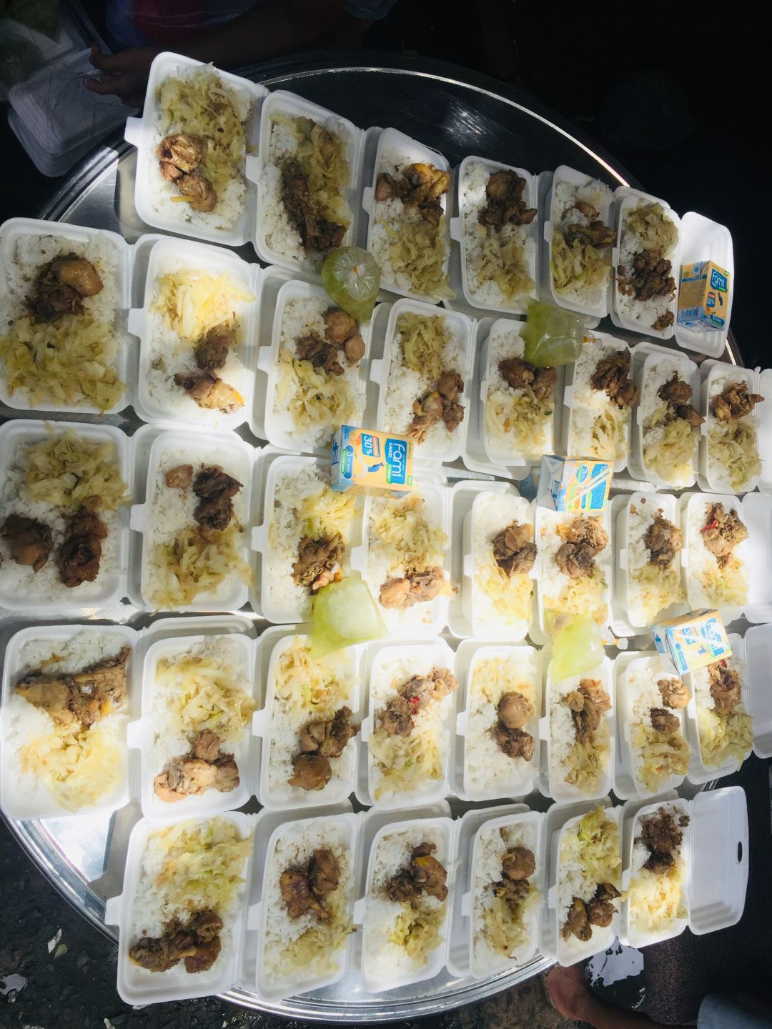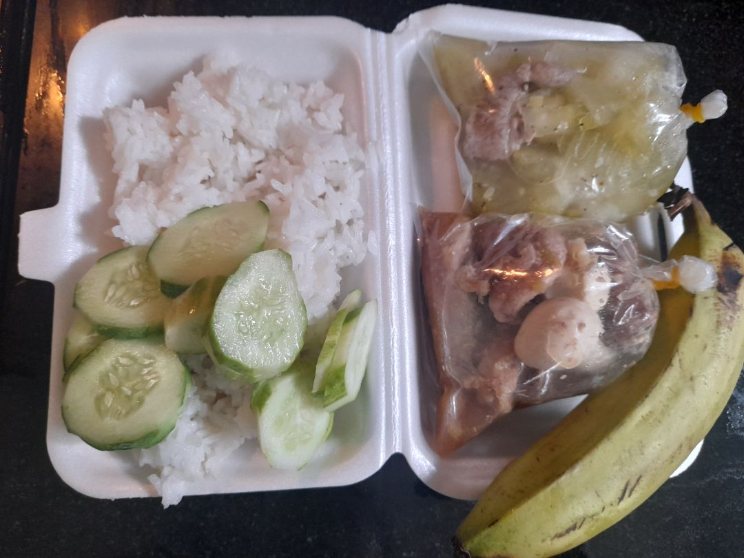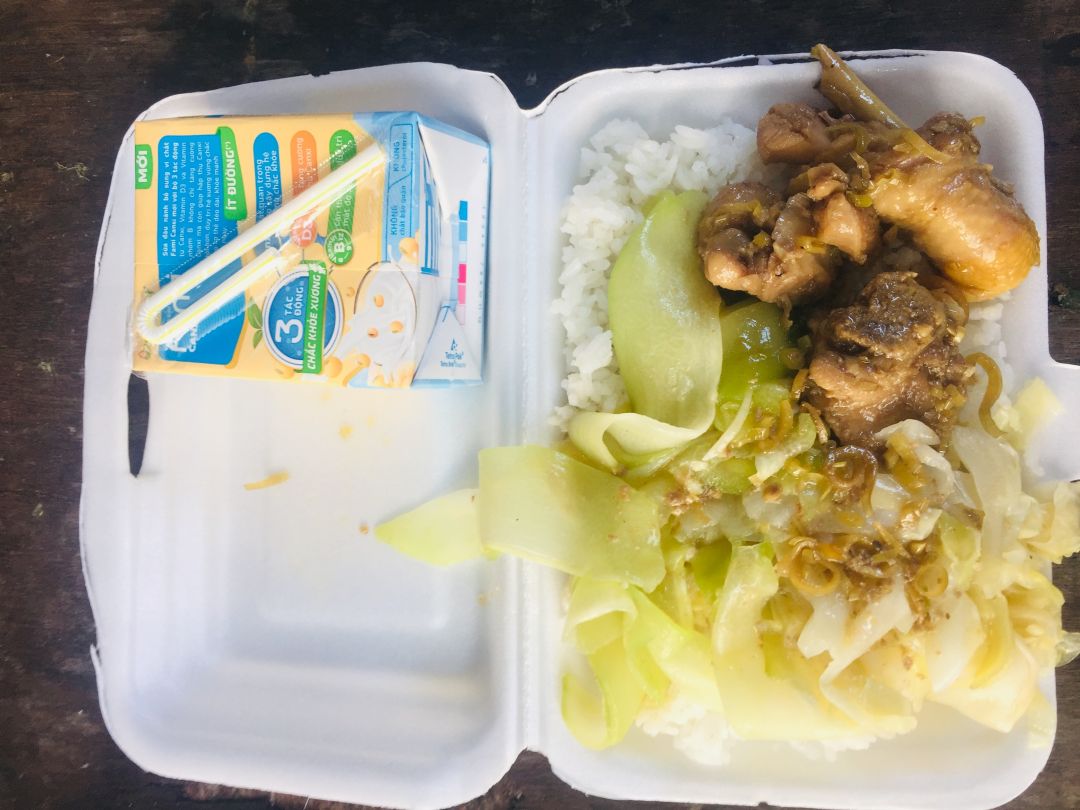 - Trưa : 64 phần cơm thịt chiên xả, xu hào xào, canh bắp cải nấu với sườn, sữa Fami