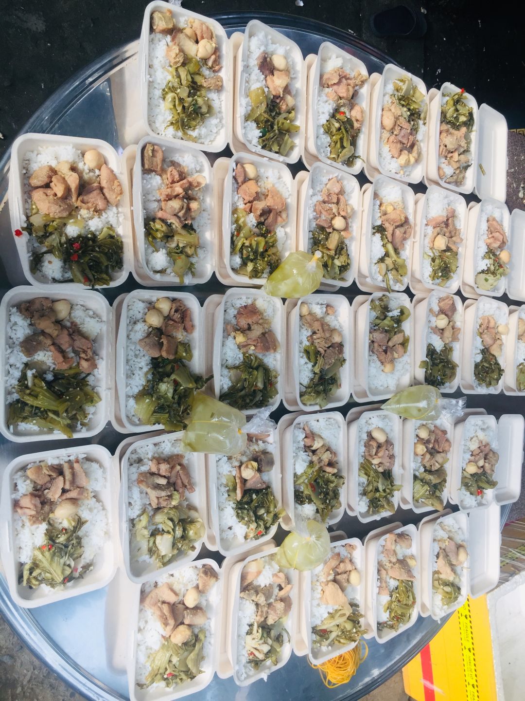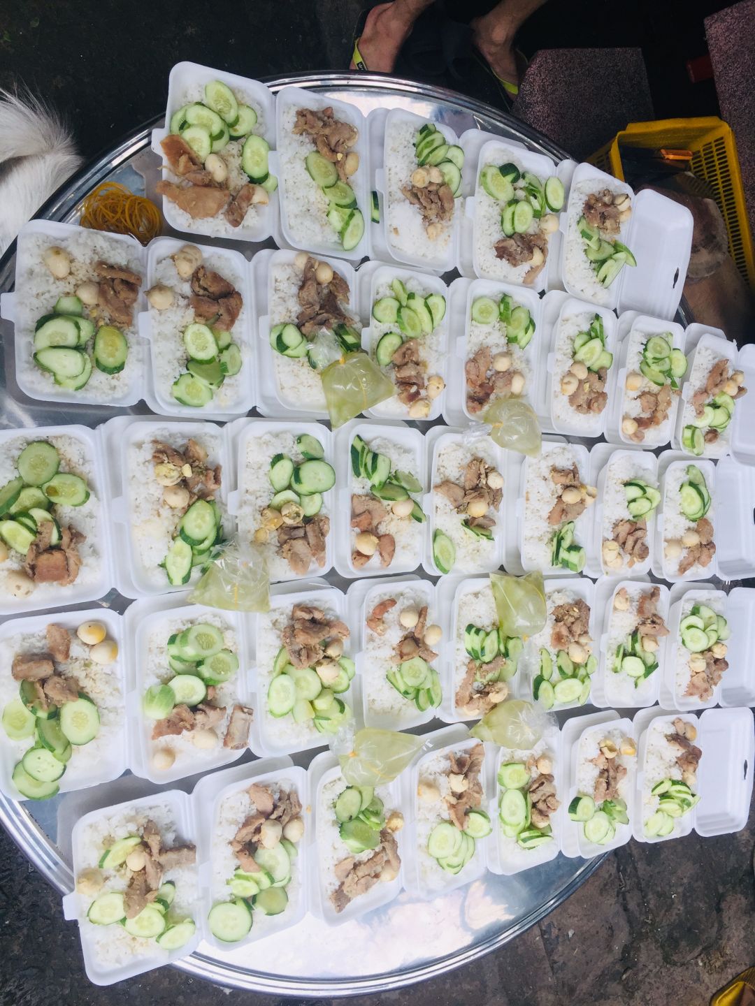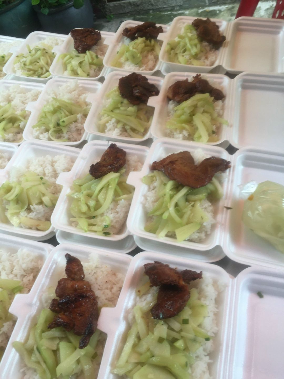 - Trưa : 64 phần cơm thịt chiên xả, xu hào xào, canh bắp cải nấu với sườn, sữa Fami