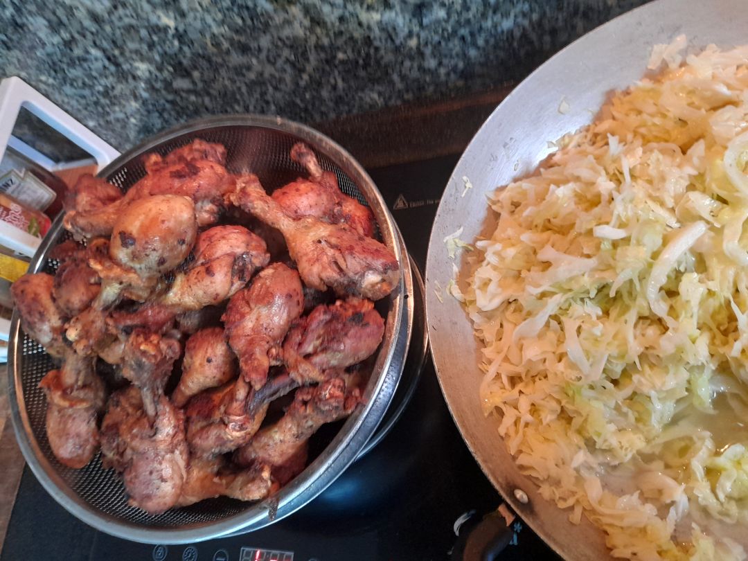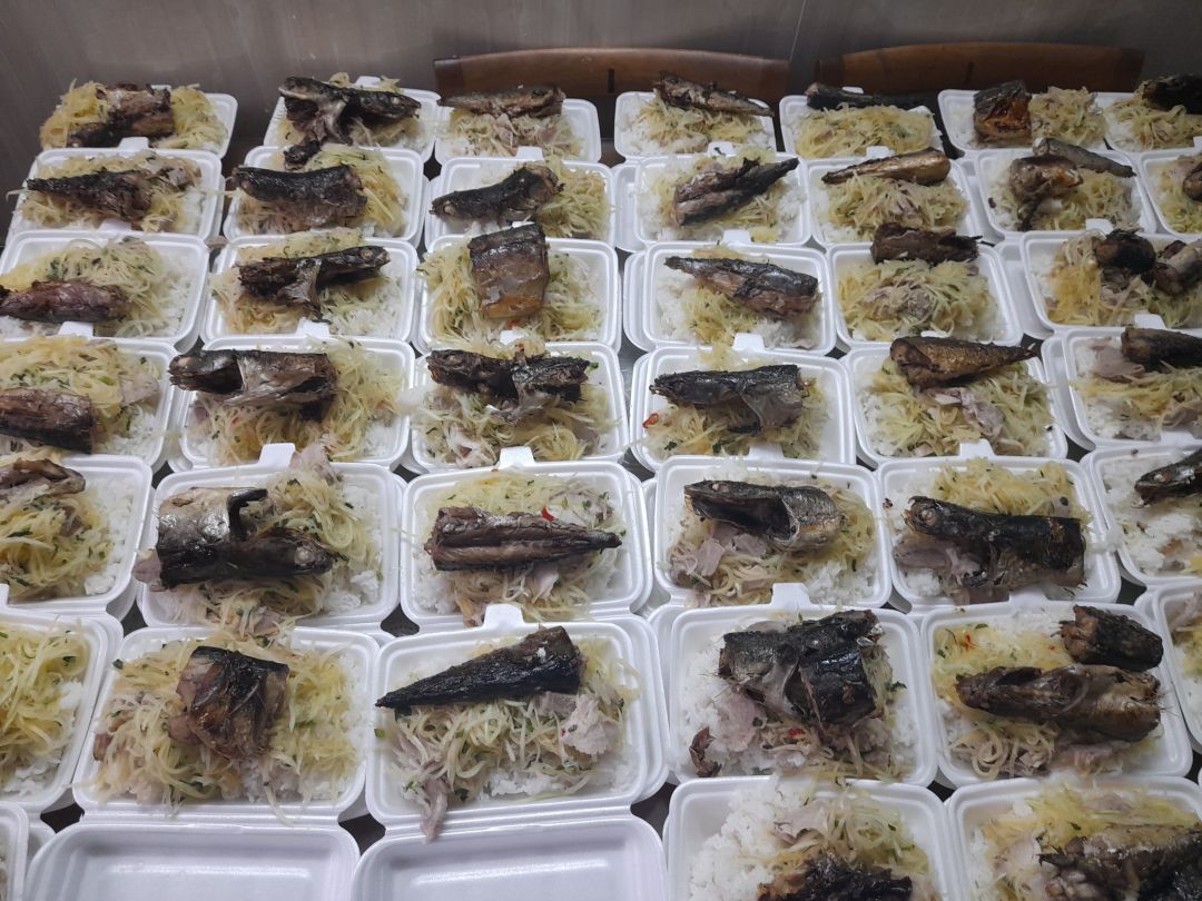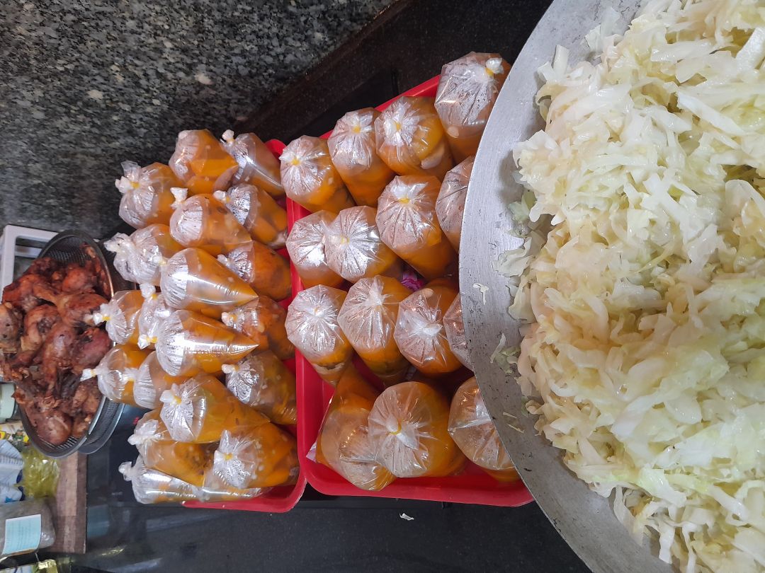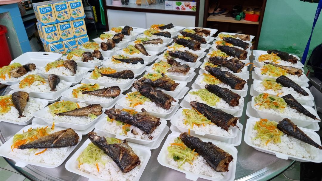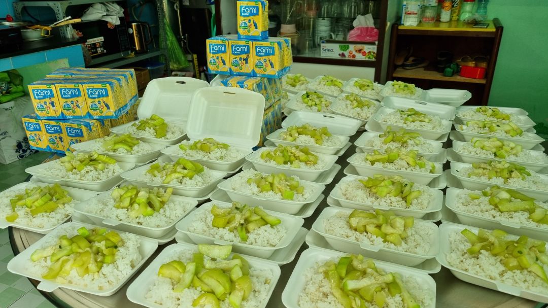 Sáng nấu 255 phần cơm gà kho sả ớt; bắp cải+ hành tây xào; canh su su+ cà rốt+ sườn que và sữa Fami cho người già với trẻ em