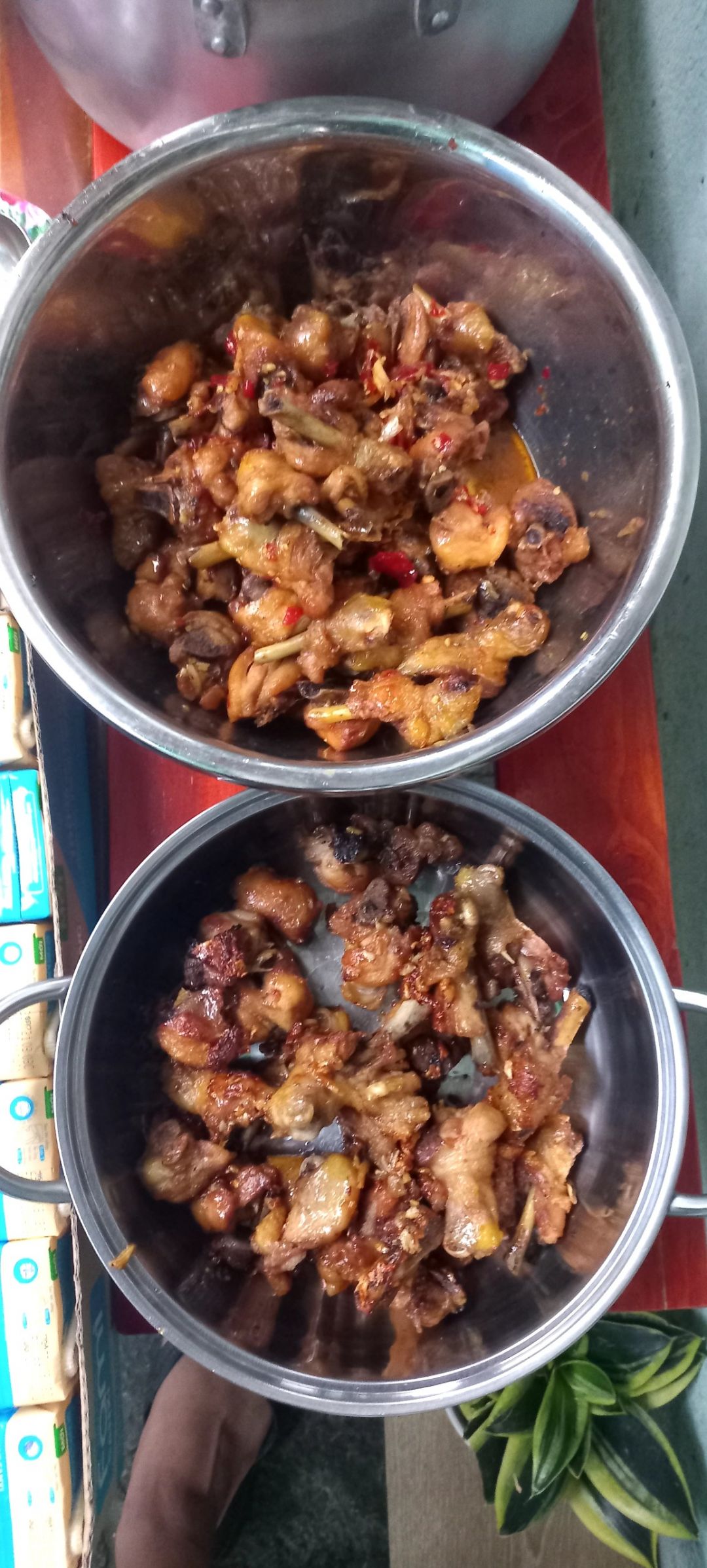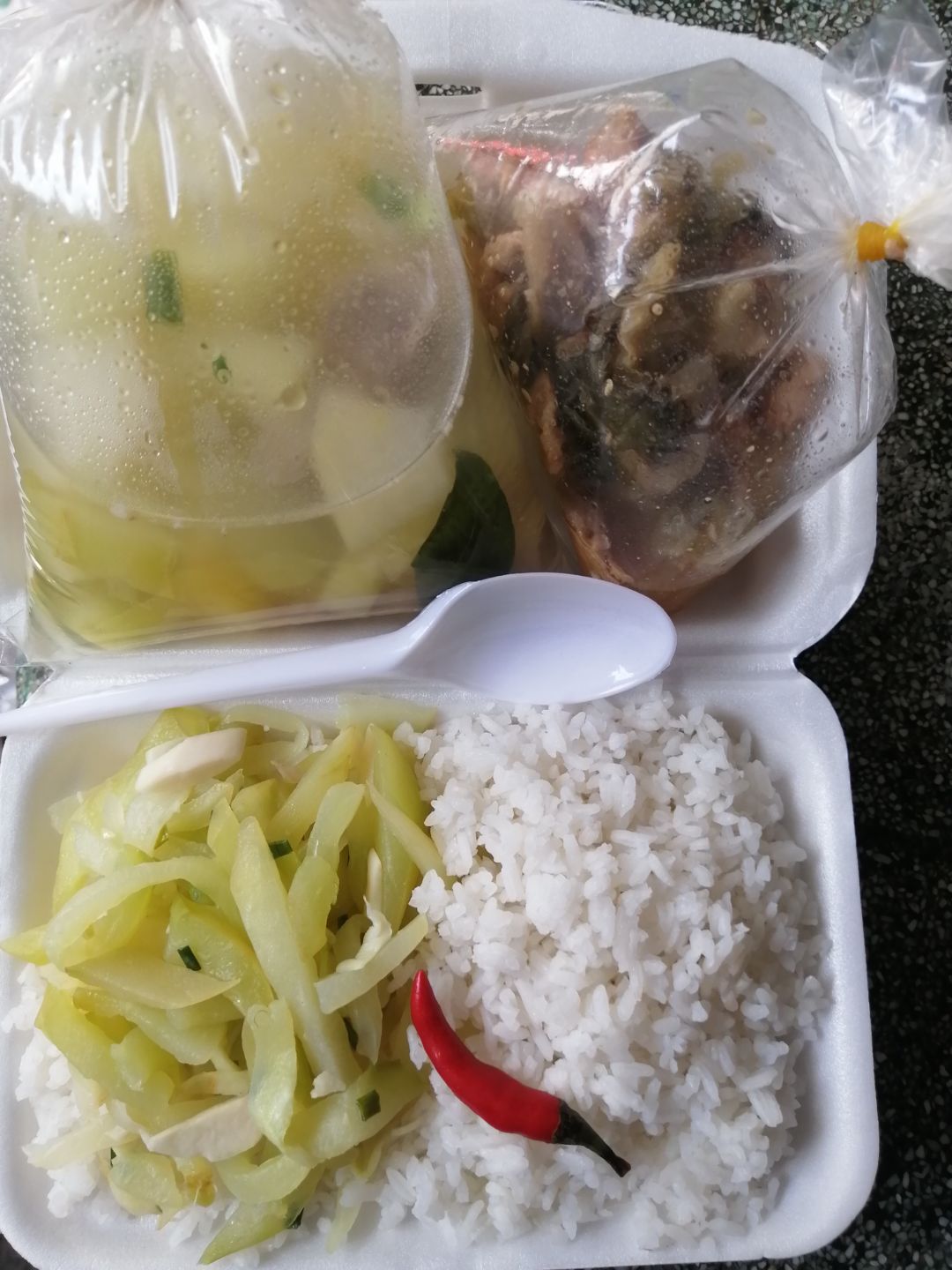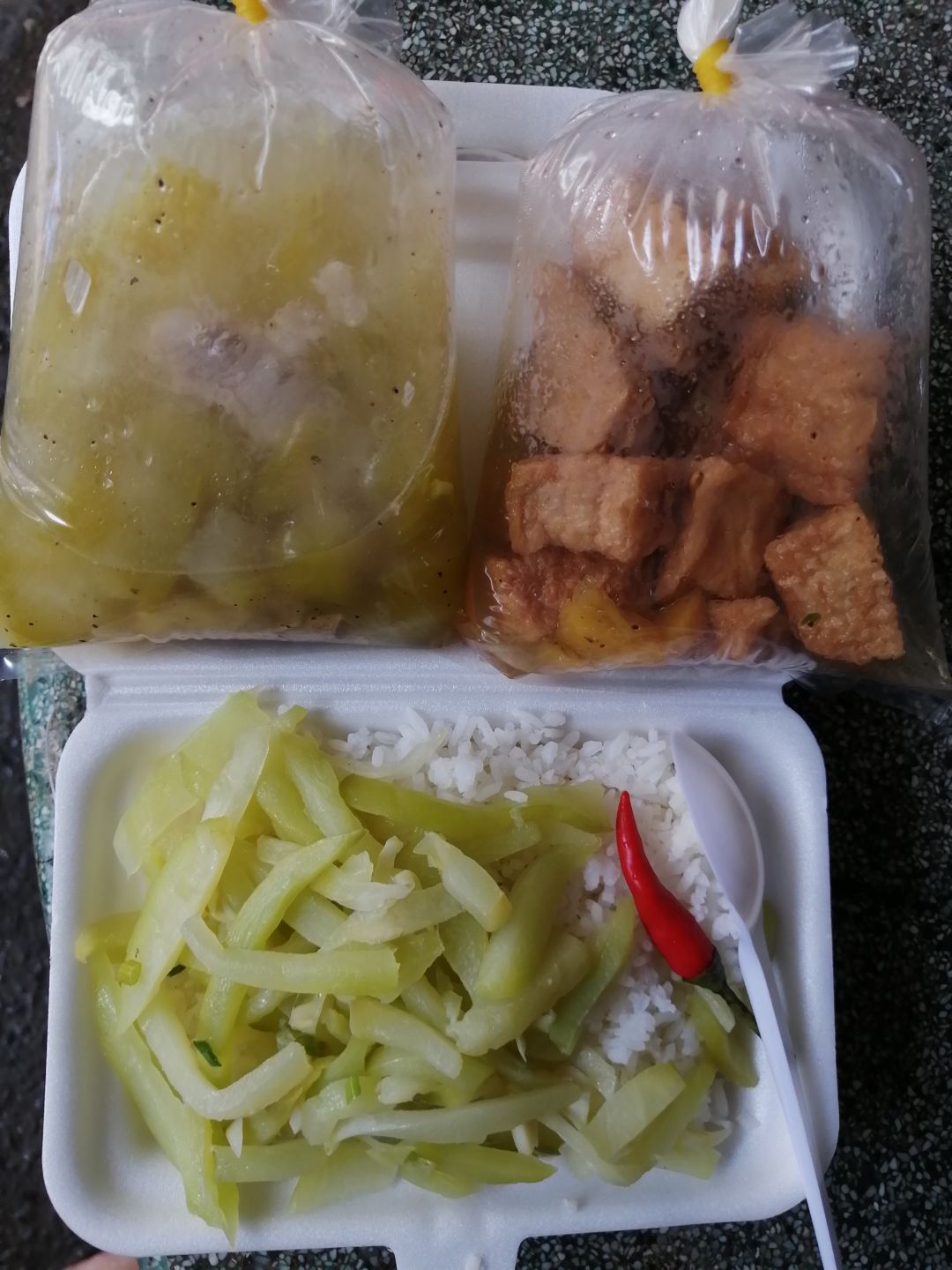 Sáng nấu 255 phần cơm gà kho sả ớt; bắp cải+ hành tây xào; canh su su+ cà rốt+ sườn que và sữa Fami cho người già với trẻ em