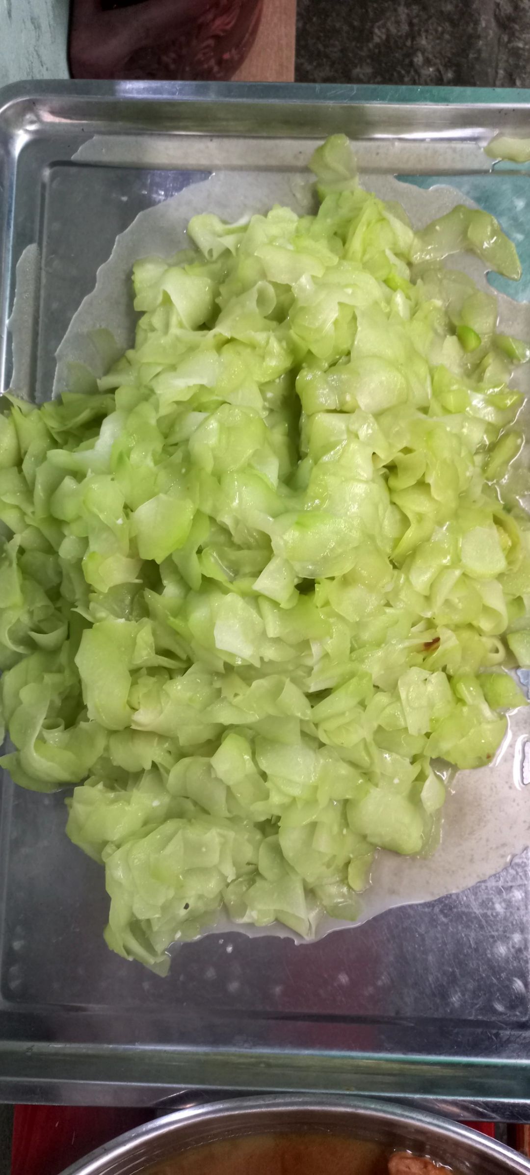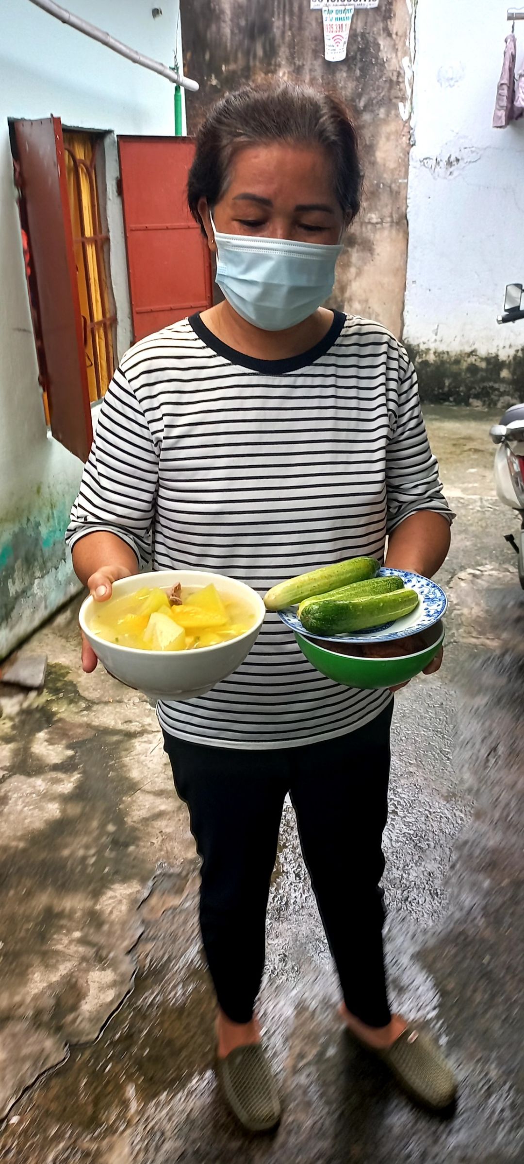 Sáng nấu 260 phần cơm thịt heo kho trứng cút; dưa leo cắt lát; canh bí đao+ sườn que.