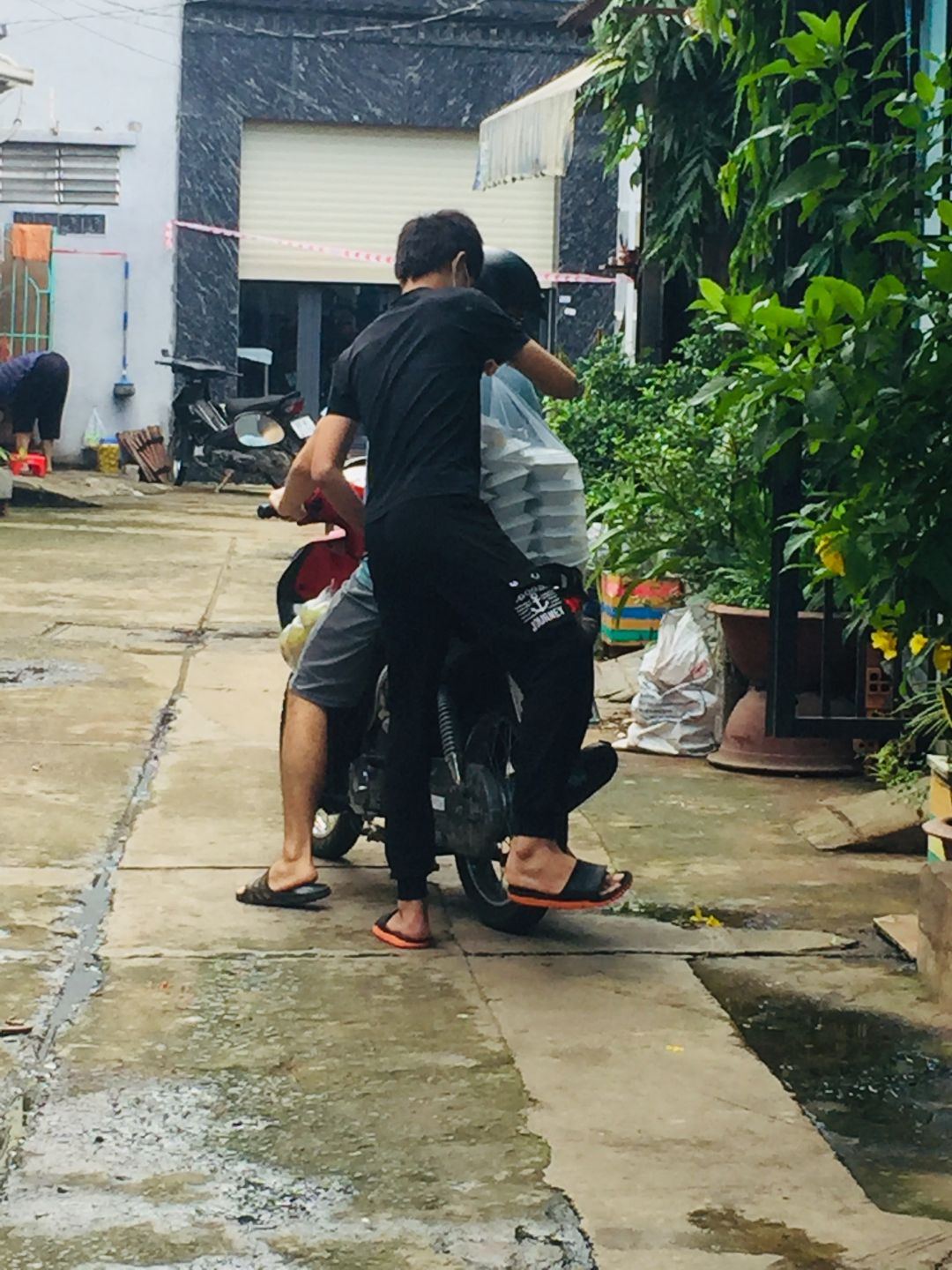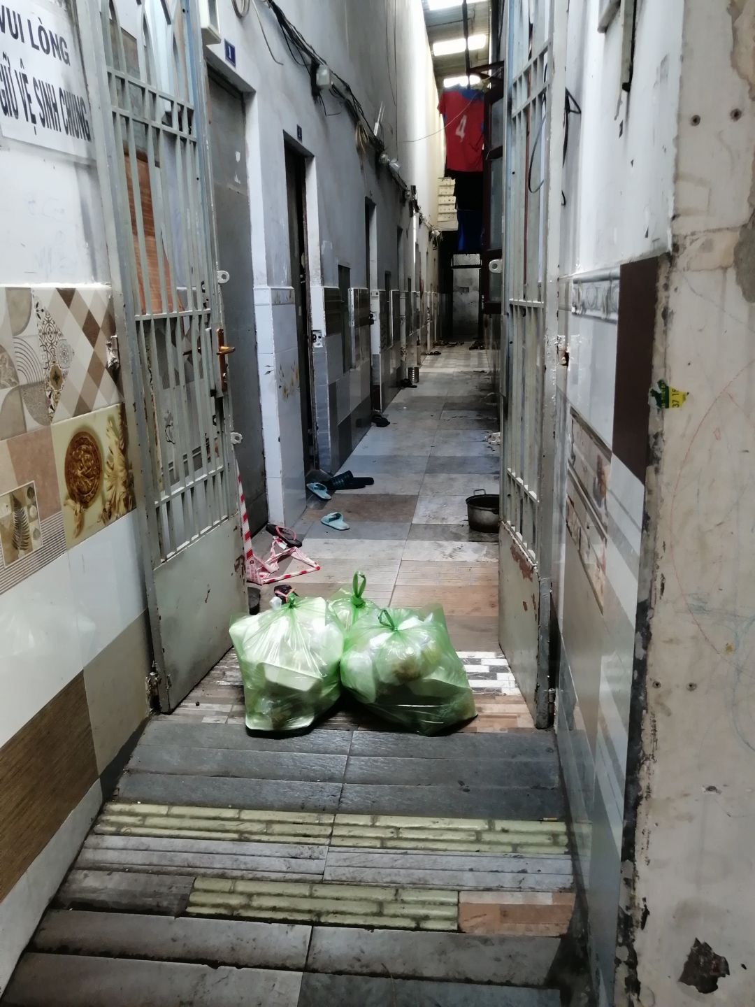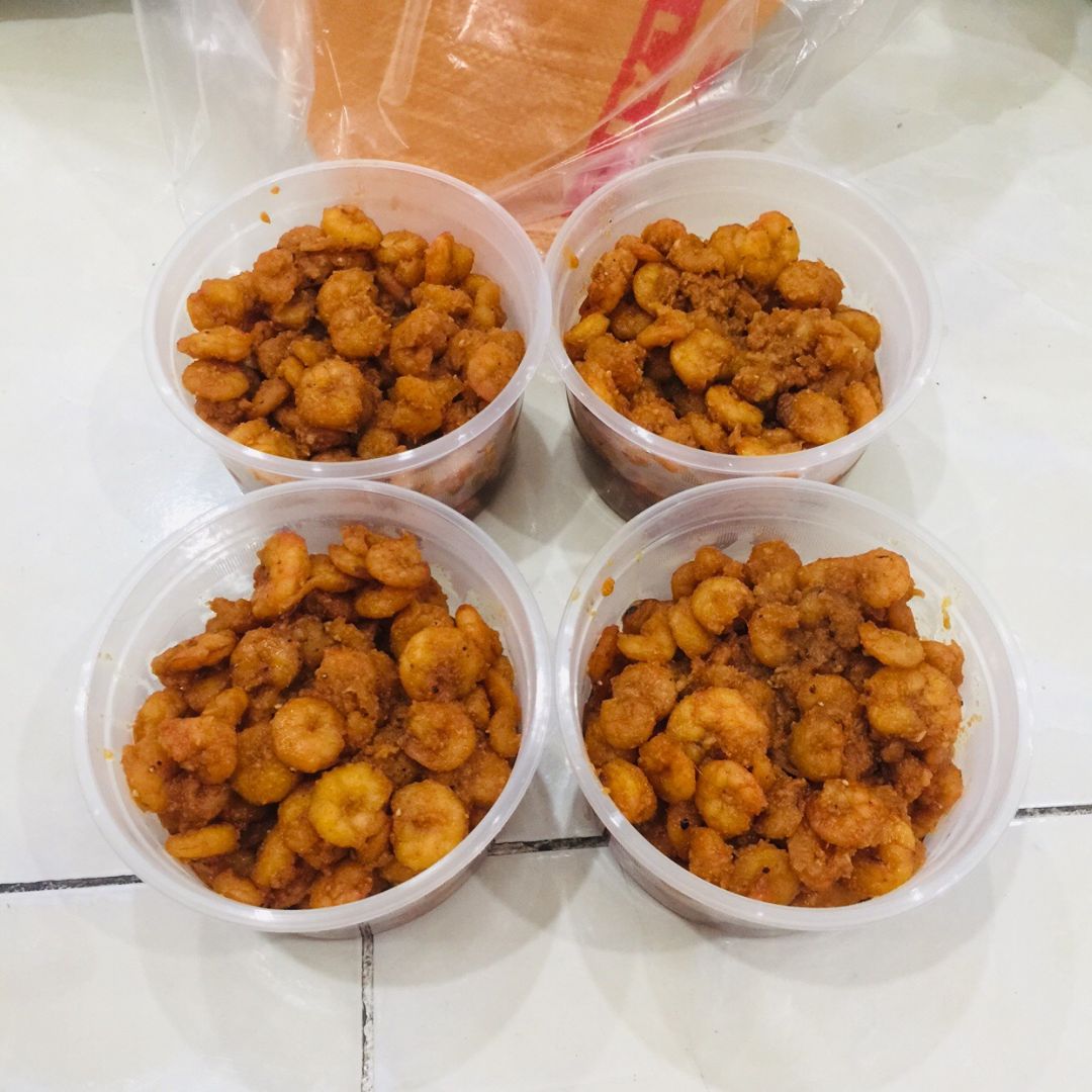 Các nguyên liệu còn lại và món tôm rim mặn, Bếp chia làm 4 phần phát cho 2 hoàn cảnh phụ hồ bị kẹt ở lại ngay công trình và 2 hoàn cảnh neo đơn khác trong kp.