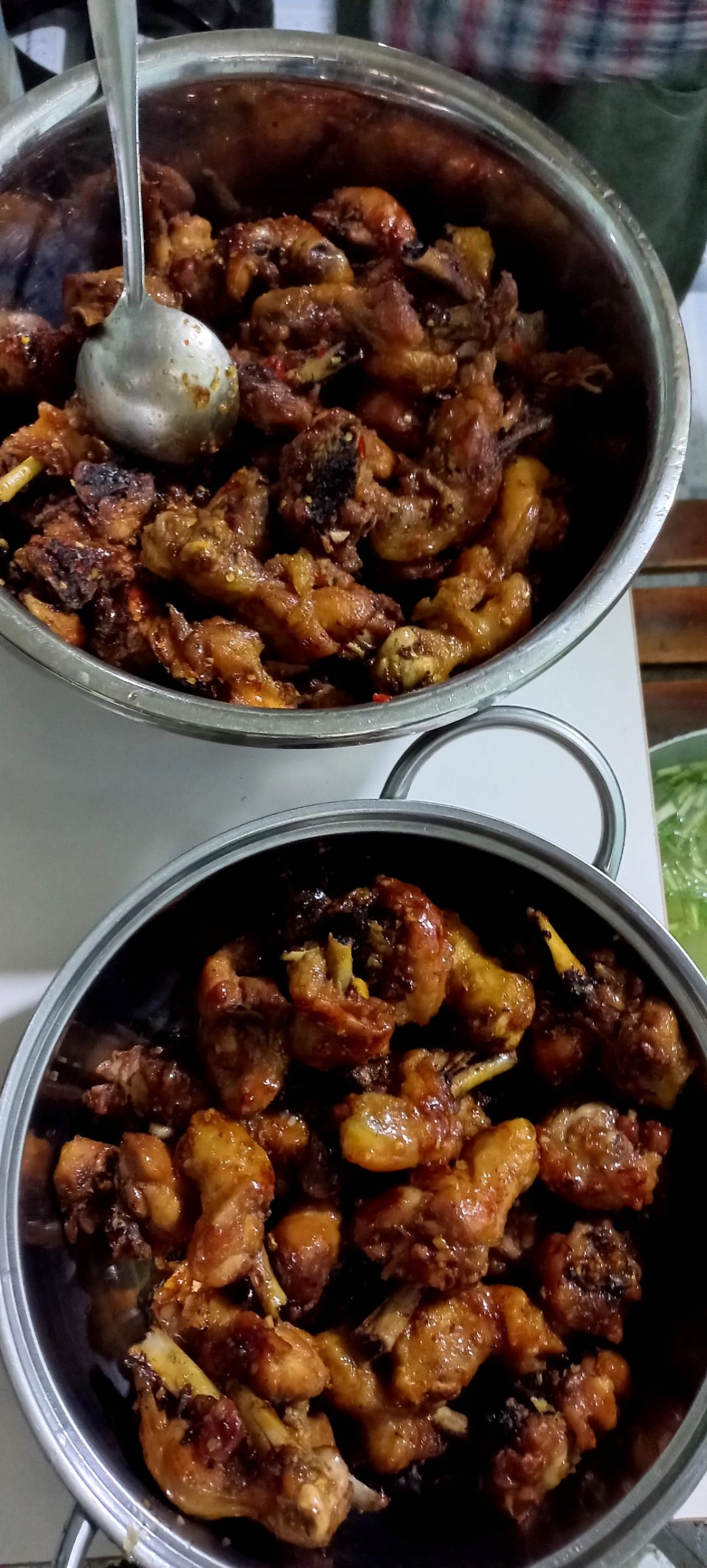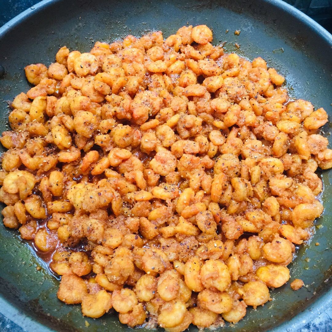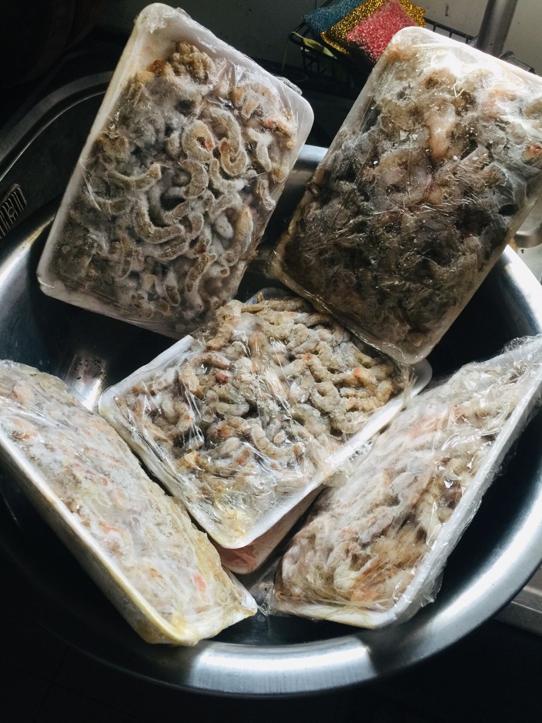 Các nguyên liệu còn lại và món tôm rim mặn, Bếp chia làm 4 phần phát cho 2 hoàn cảnh phụ hồ bị kẹt ở lại ngay công trình và 2 hoàn cảnh neo đơn khác trong kp.