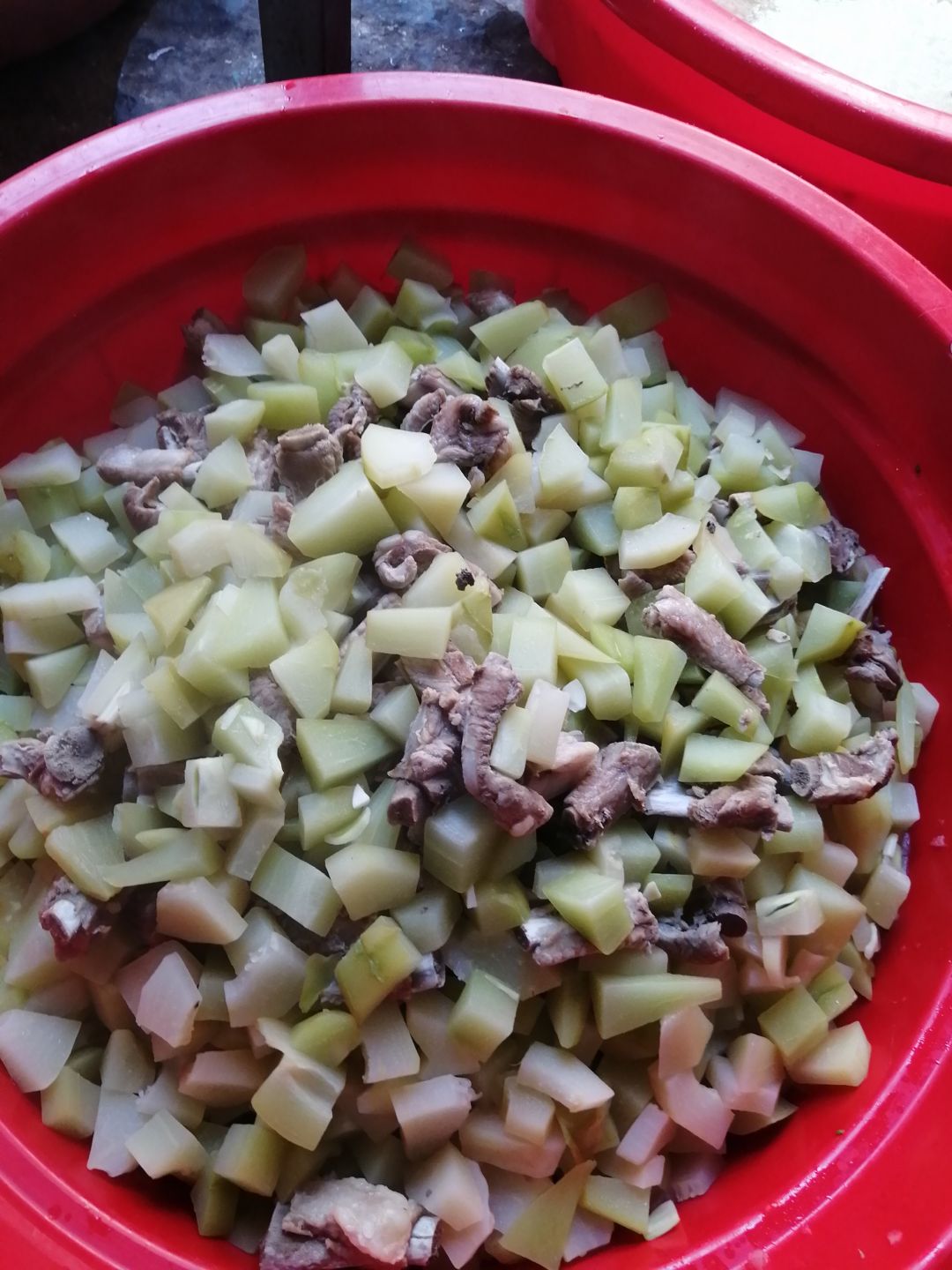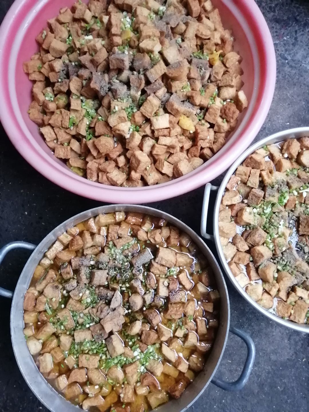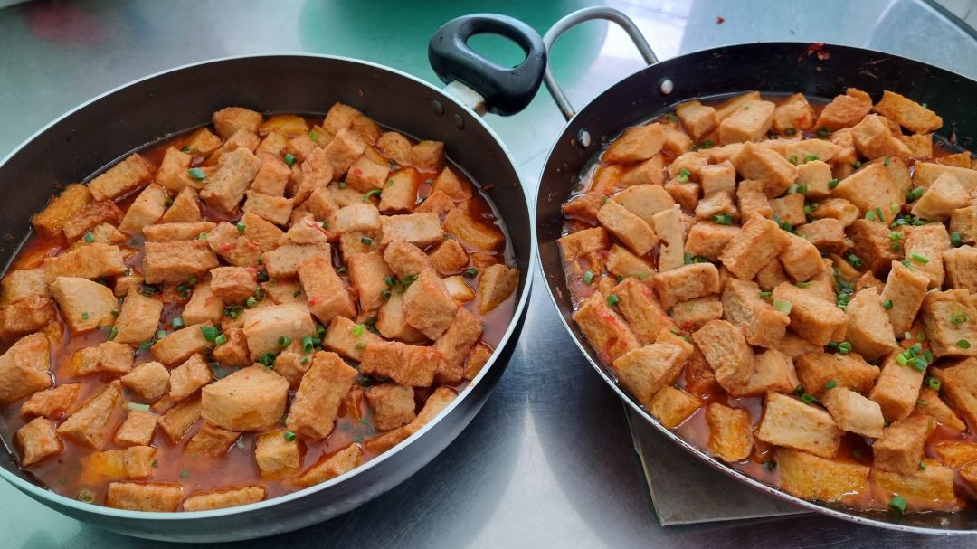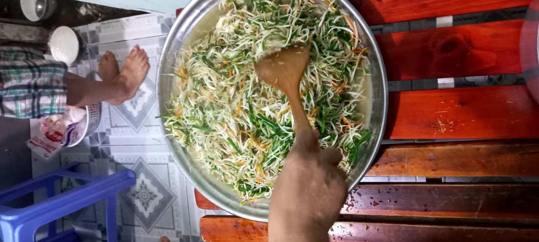Chiều nấu 250 phần cơm thịt heo kho trứng cút; dưa cải trộn ớt tỏi đường; canh bí đao+ sườn que.