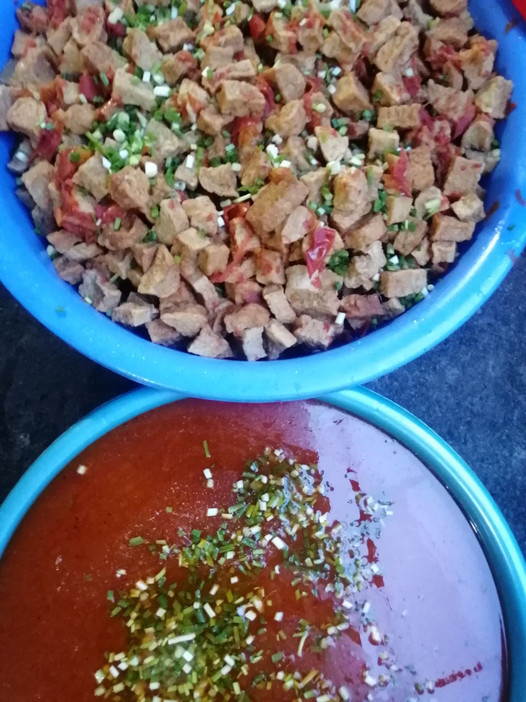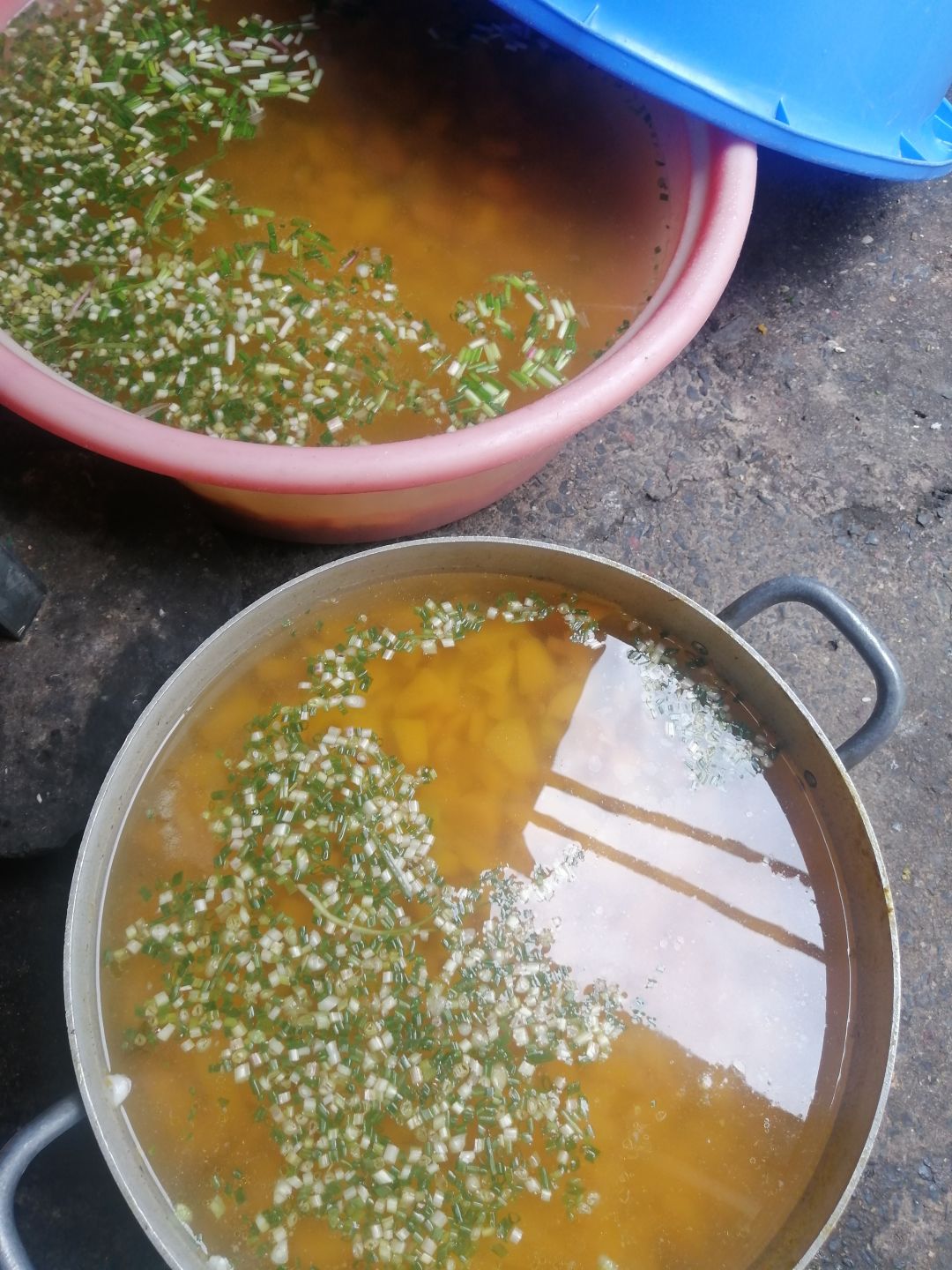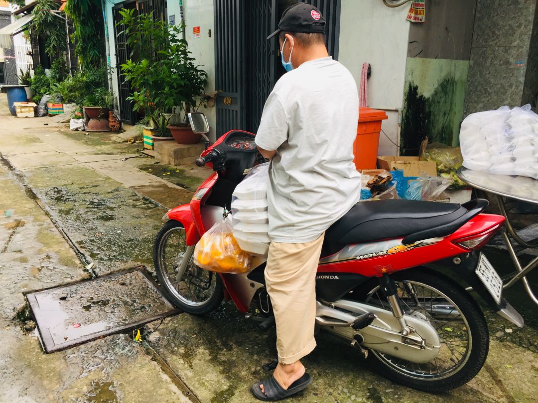 Chiều nấu 265 phần cơm thịt cốt lết ram tỏi ớt; dưa leo cắt lát; canh bí đỏ+ sườn que và sữa Fami cho người già và con nít.