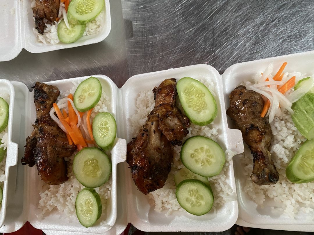 - chiều : 64 phần cơm đùi gà nướng, canh soup xương.