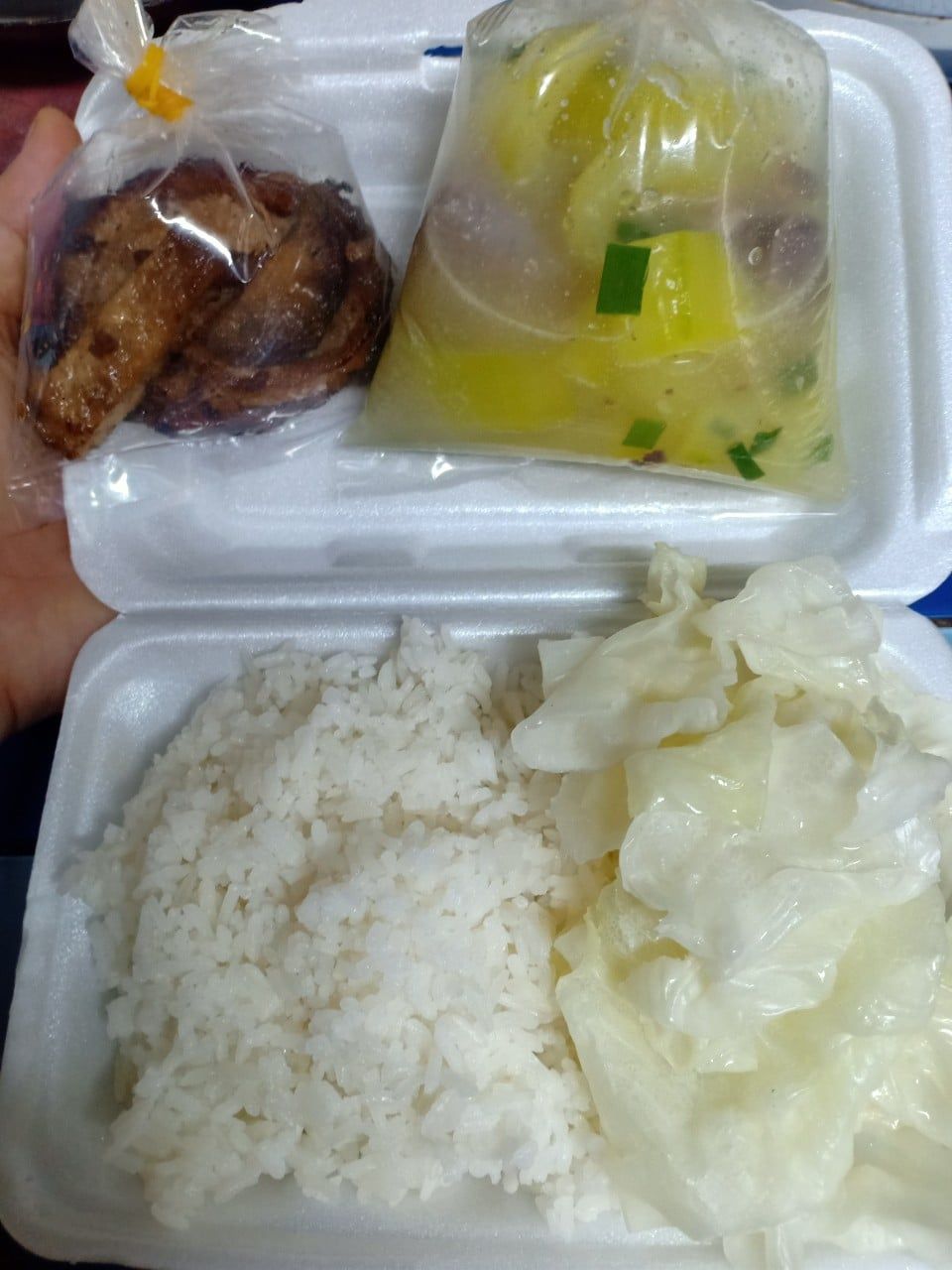Sáng nấu 265 phần cơm chả cá sốt cà+ hành tây; cải thảo+ bắp cải+ cà rốt xào; canh mướp+ sườn que và sữa Fami cho người già, trẻ em.