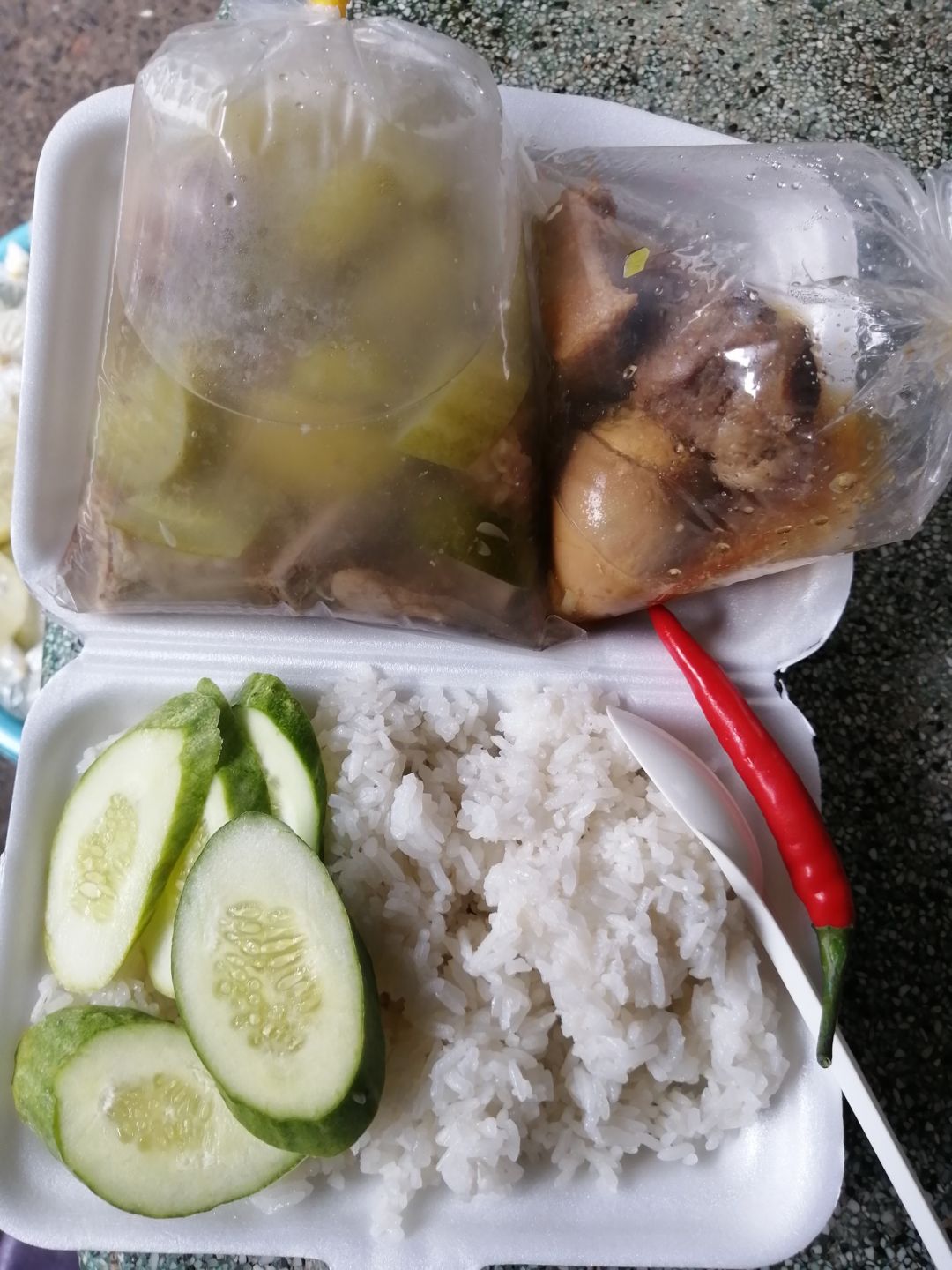 Sáng nấu 265 phần cơm gà kho nghệ; dưa leo cắt lát; canh bí đao+ sườn que.