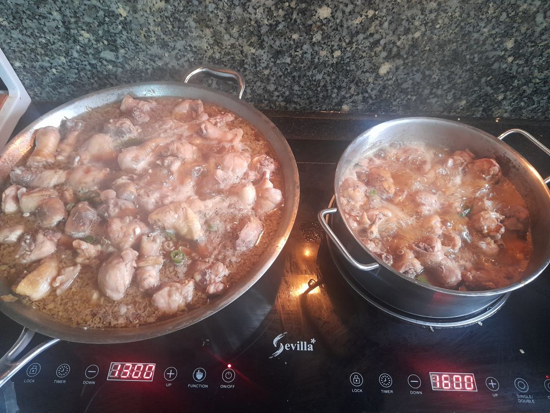 Chiều nấu 255 phần cơm gà kho nghệ; bắp cải xào; canh bí đao+ sườn que.