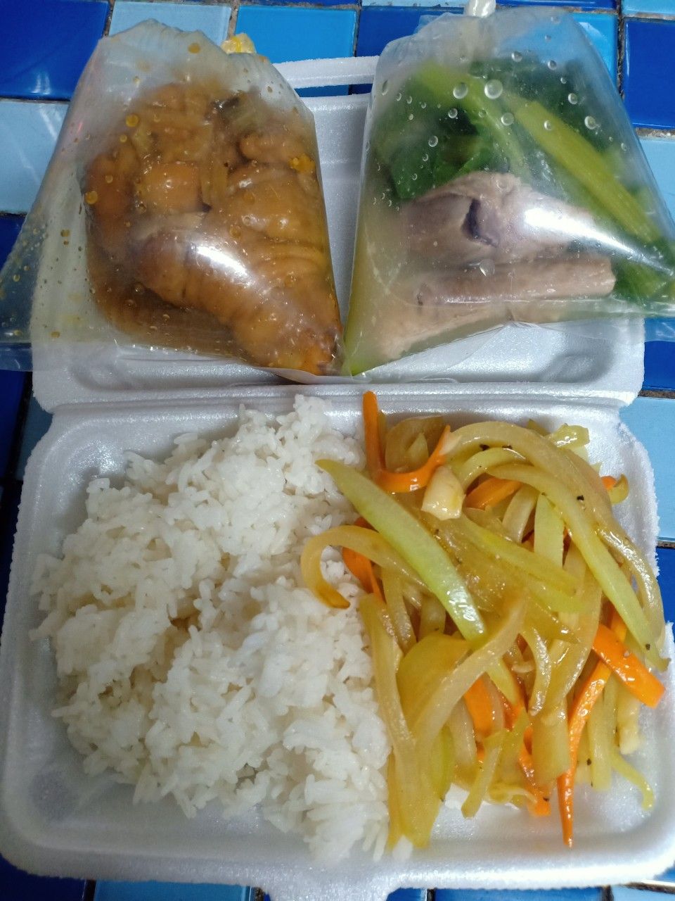 - Chiều : 64 phần cơm thịt chiên, canh bí xanh nấu với xương.