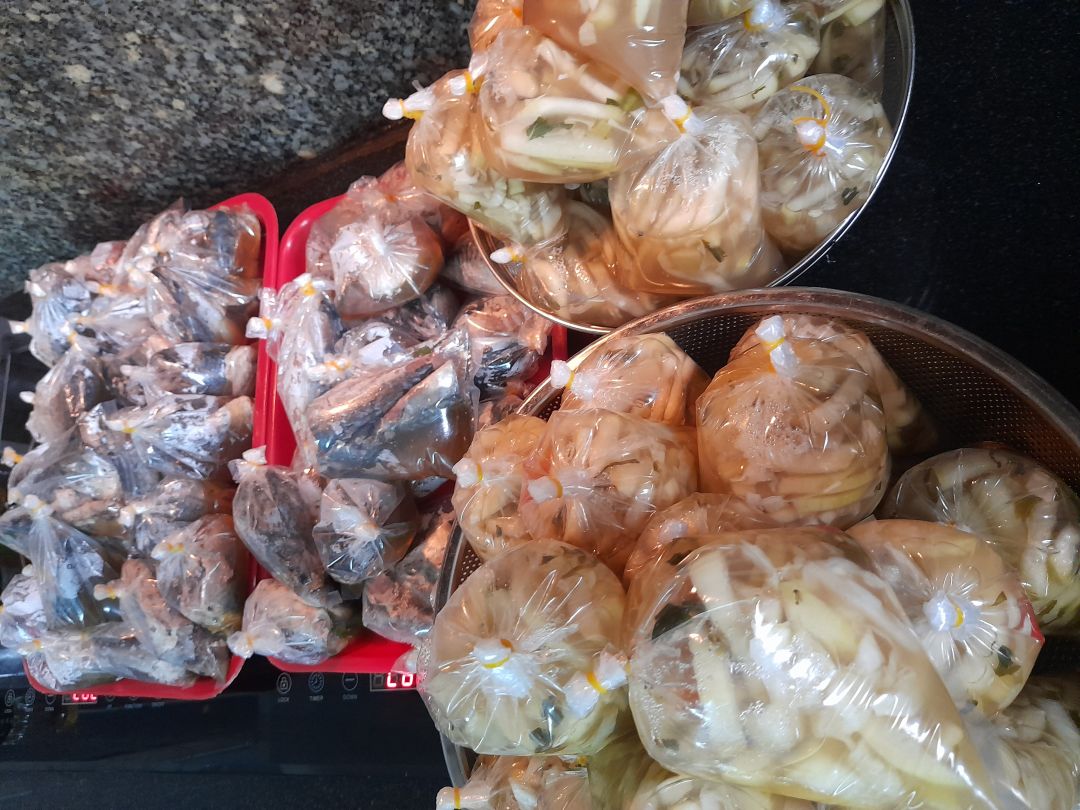 Sáng nấu 245 phần cơm cá saba chiên; rau muống xào tỏi; canh cải ngọt+ sườn que.