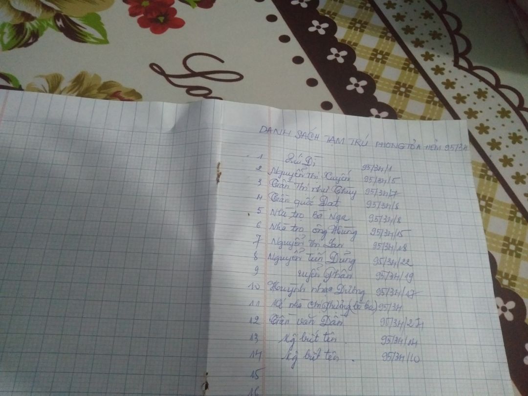 Thiên Hải Anh xin đăng ký hỗ trợ Vitamin C, 3B, dung dịch sát khuẩn và khẩu trang cho 231 hộ khó khăn có người già, tật nguyền đang bị cách ly trong hẻm 95 khu vực đang bị cách ly hơn tháng nay. Thiên Hải Anh gửi kèm hình ảnh danh sách các hộ khó khăn do tổ trưởng khu phố gửi xin.