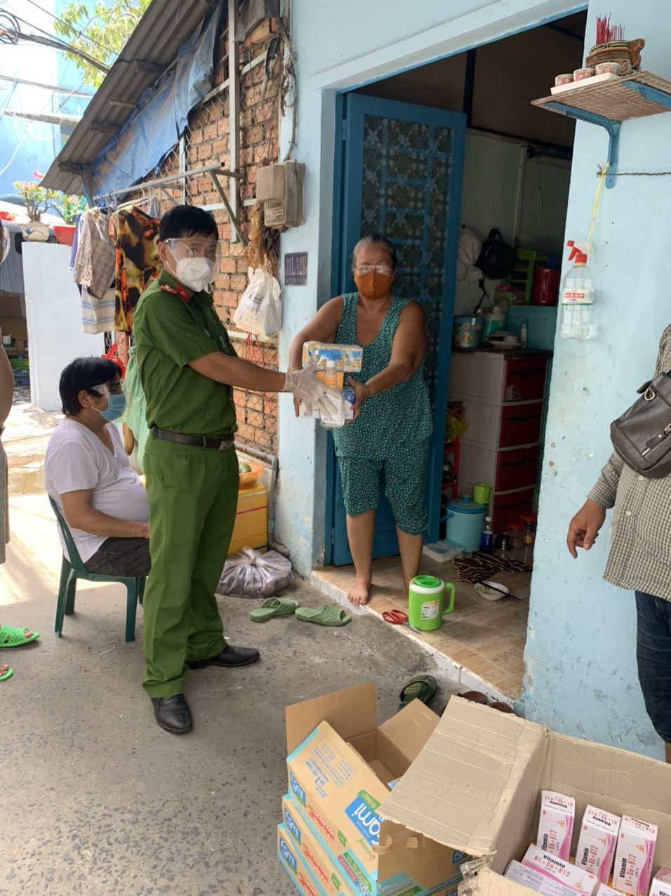 Nhờ vào mối quan hệ tốt với các nhà máy sản xuất của chị Phúc (vợ bác P.Quyen)- Chủ nhân căn nhà 14/1 Ngô Quyền mà chúng ta đang sử dụng suốt 12 năm qua nên sáng sớm hôm qua 6x đã nhận được 17 thùng Khẩu trang y tế (50 hộp/thùng), 10 thùng Vitamin 3B (165 hộp/thùng), 8 thùng Vitamin C (100 hộp/thùng) để kịp thời trao cho 231 hoàn cảnh thuộc phường Tân Kiểng, Q7.
