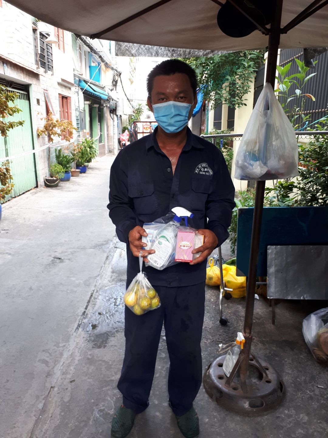Chúng ta hỗ trợ 28 phần quà gồm khẩu trang, dung dịch sát khuẩn, vitamin C, vitamin 3B cho nhóm thợ hồ tăng cường bảo vệ sức khỏe chống dịch.